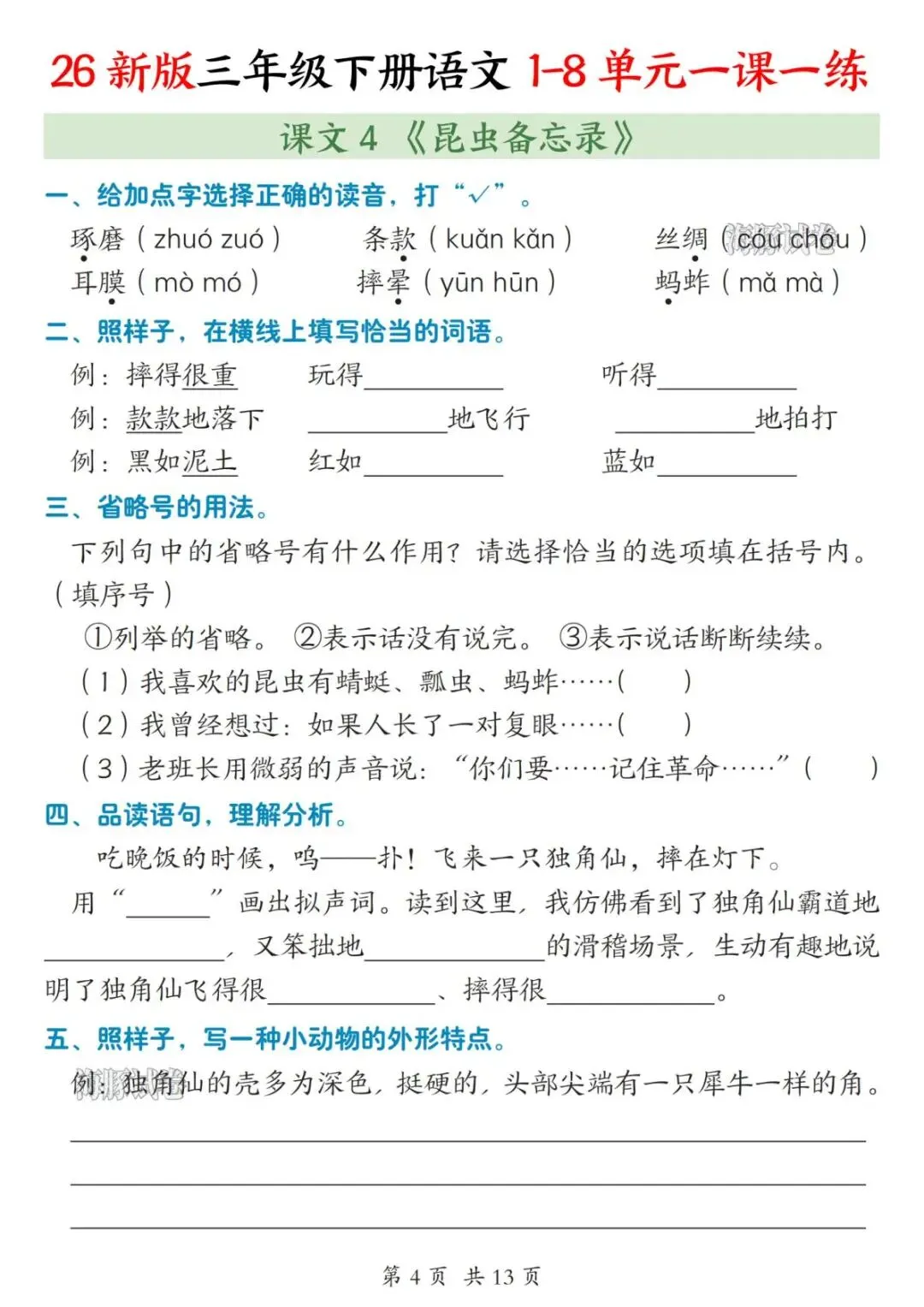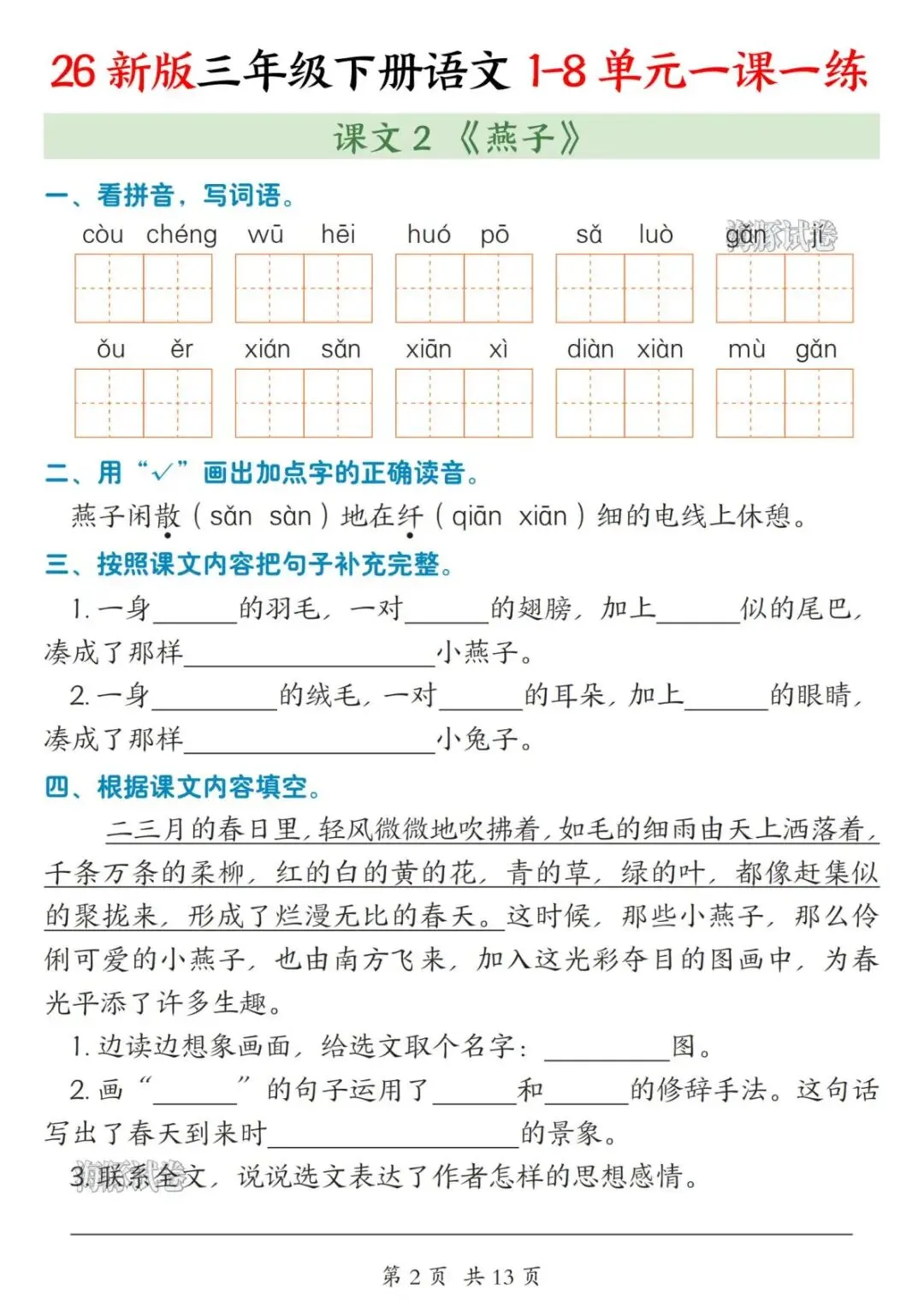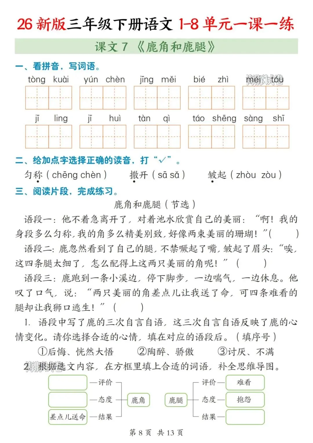 今日分享的是:三年级下册语文《1-8单元一课一练》,电子版可下载打印。