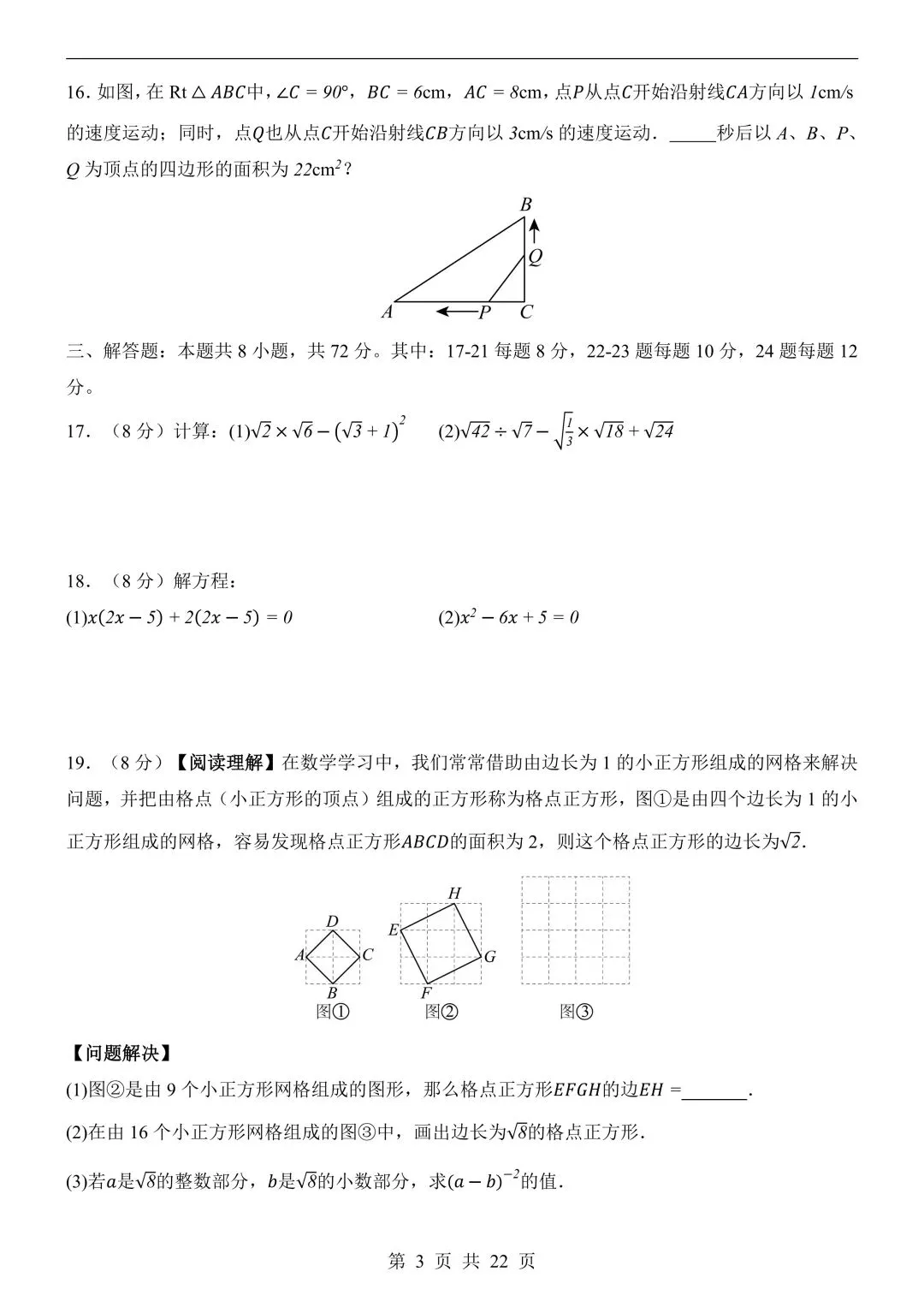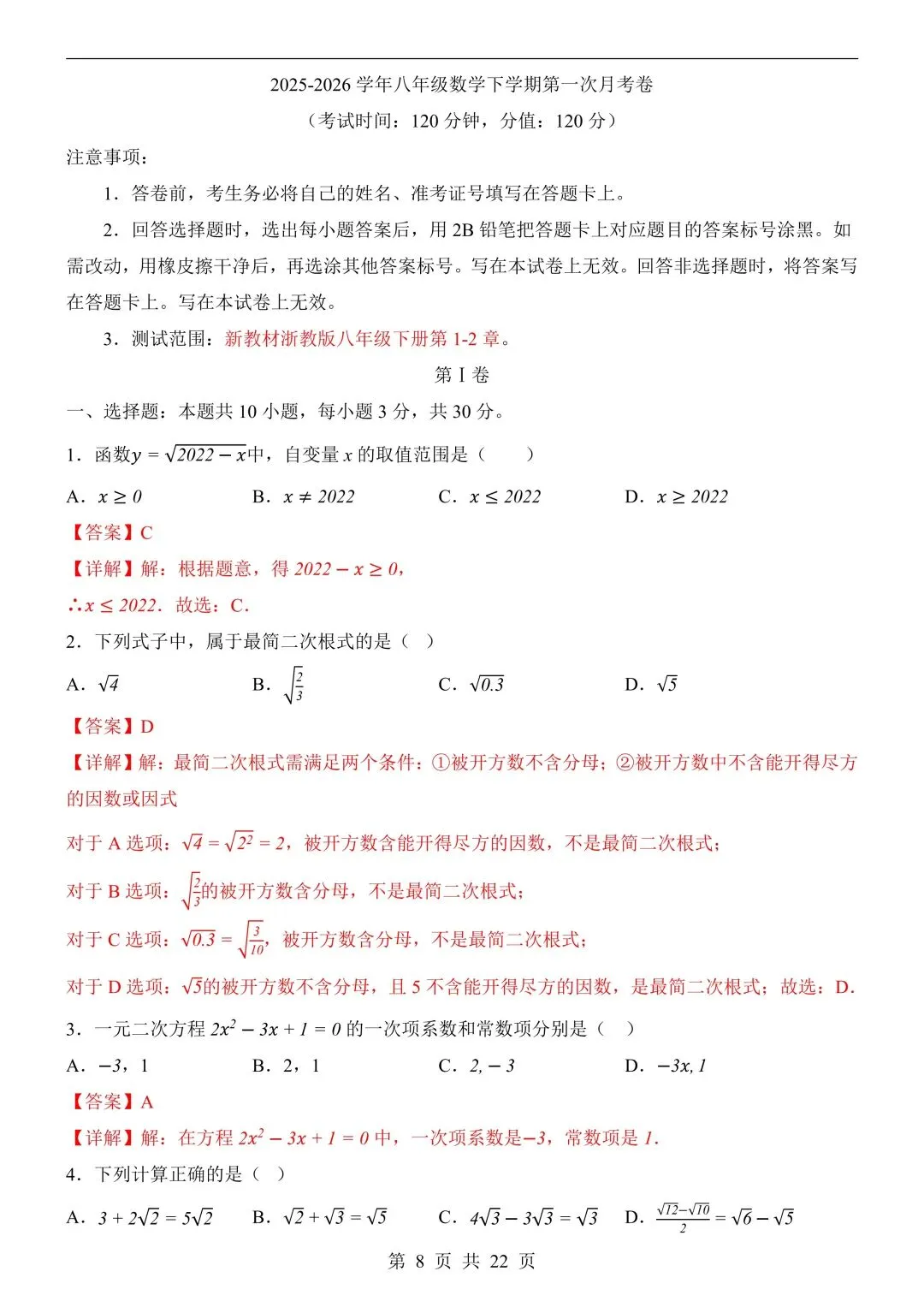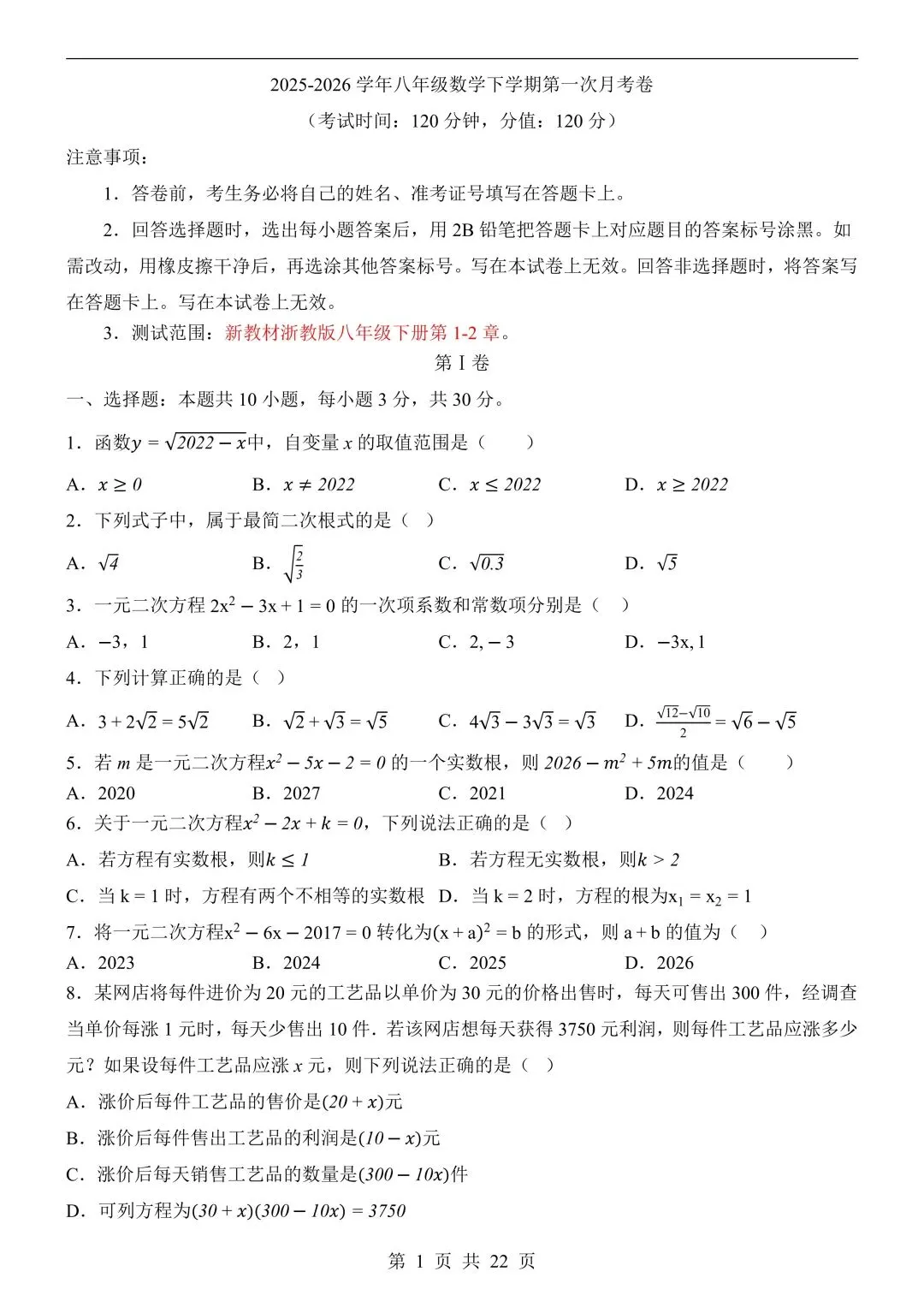 26年春新版八下数学第一次月考卷完整版含答案,电子版可打印!