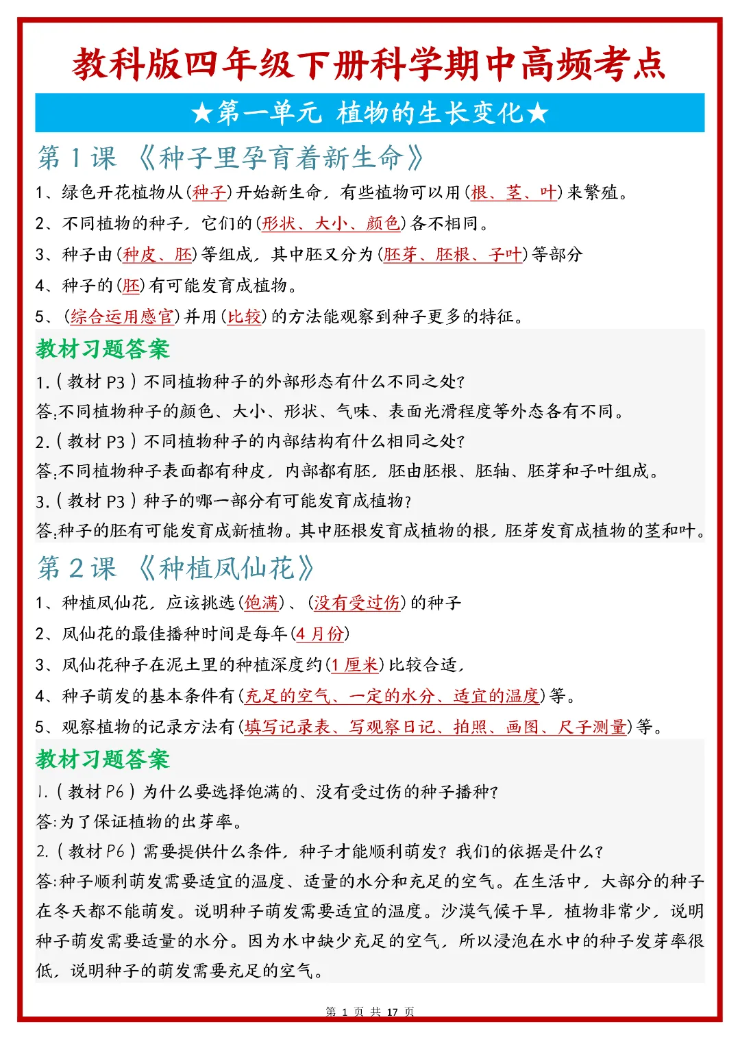 2026年春教科版四年级下册科学《期中复习高频考点汇总》,电子版可下载打印。这份资料涵盖了期中所考重点概念、实验原理、常考知识点与易错考点,帮助孩子梳理知识重点,快速熟记考点,分清易错内容,考前高效复习,轻松应对考试,助力期中考试取得好成绩!需要的家长可以打印出来,让孩子练一练!
