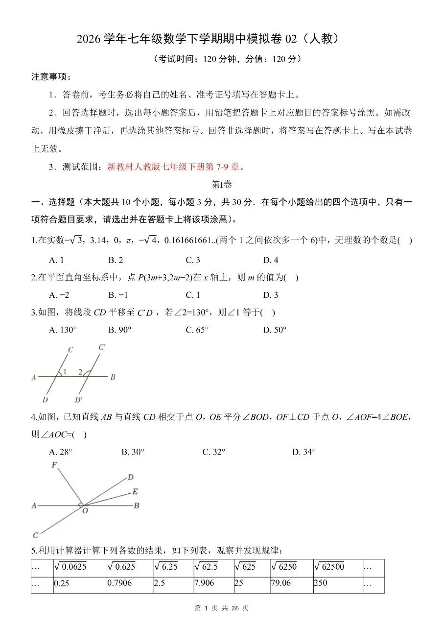 这是人教版七年级下册数学期中模拟卷02,满分120分、考试时间120分钟,考查范围为第7-9章。