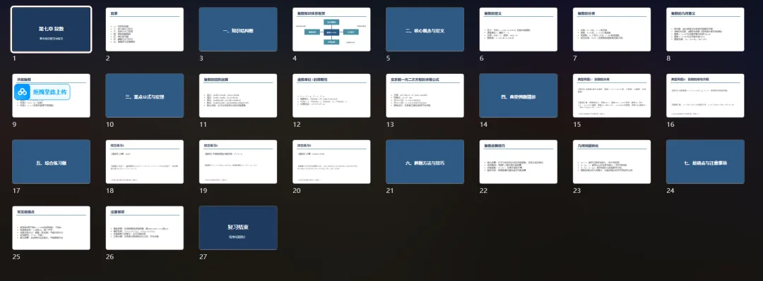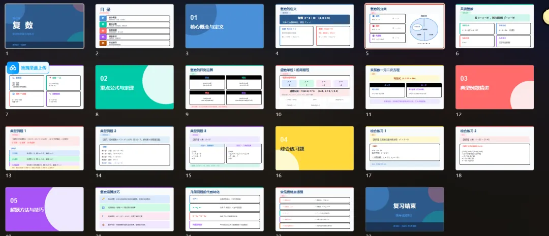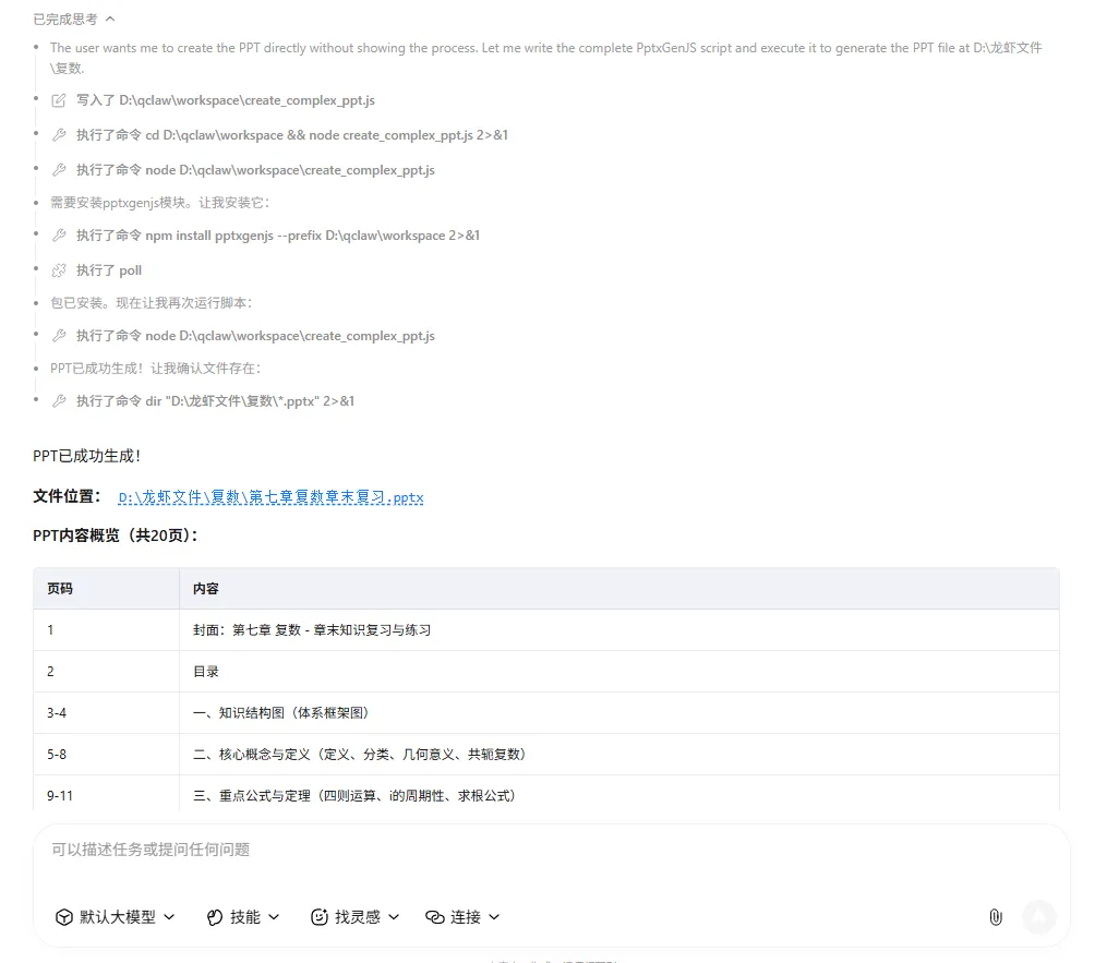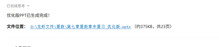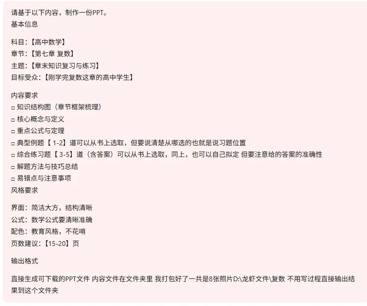 下面是我做了一个实操,生成高中数学中复数模块的 ppt。我在网站上下载了电子课本,保存到了文件夹里,让他调用,并给出了要求。