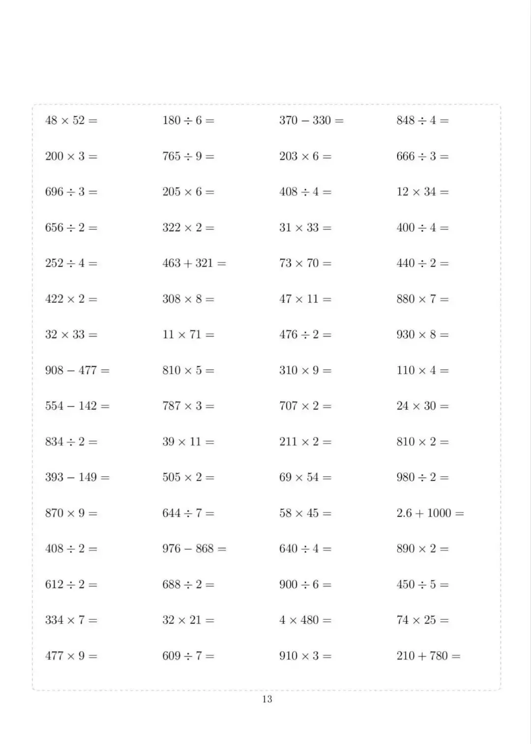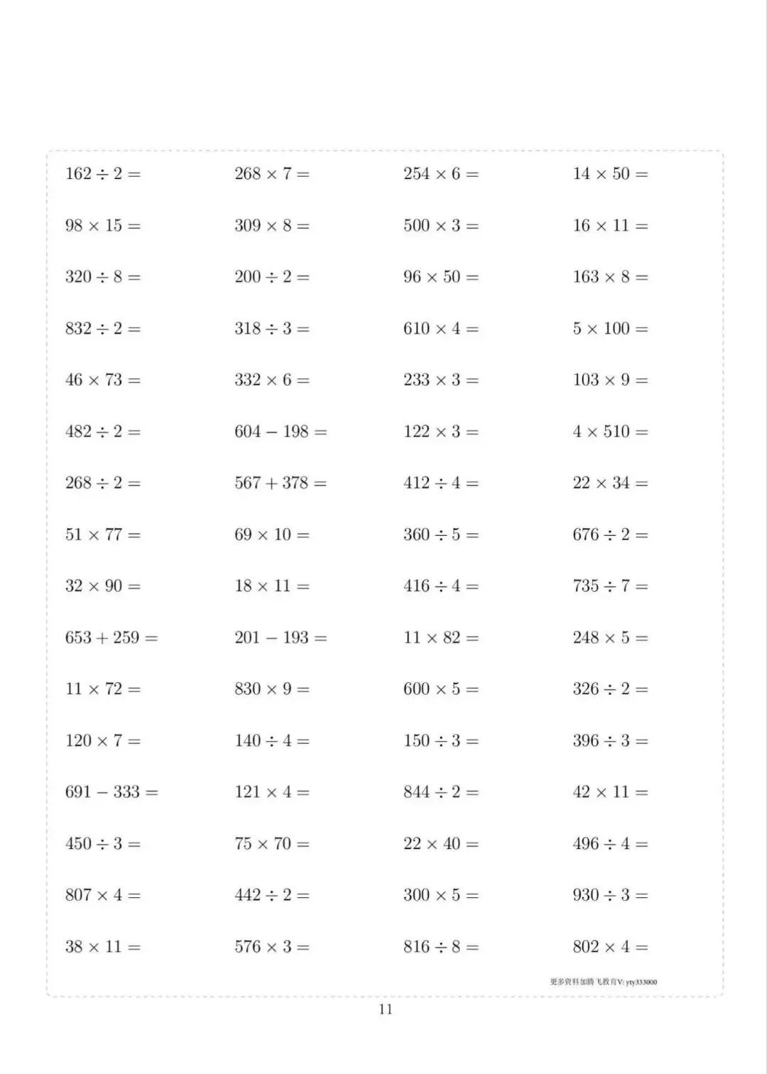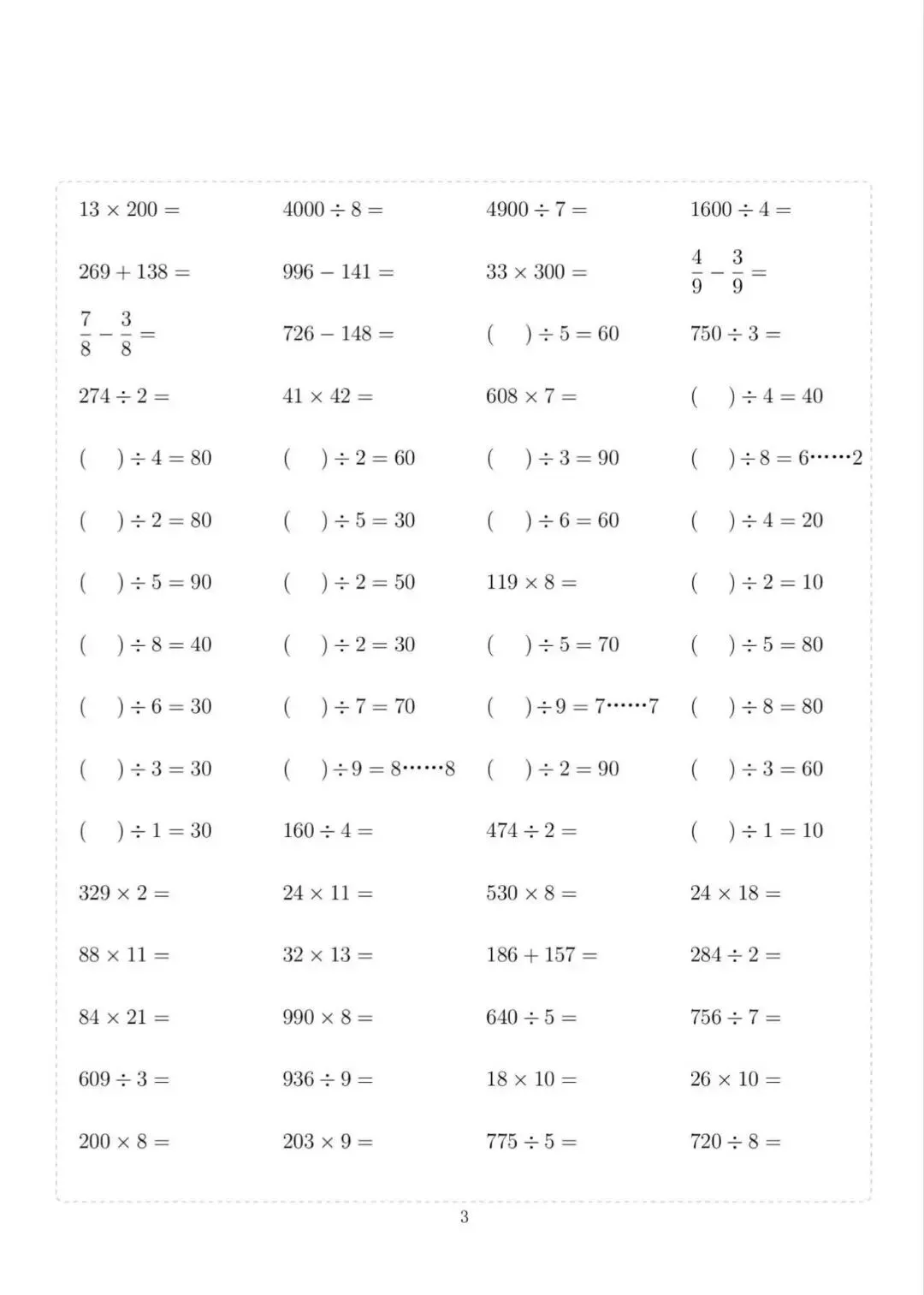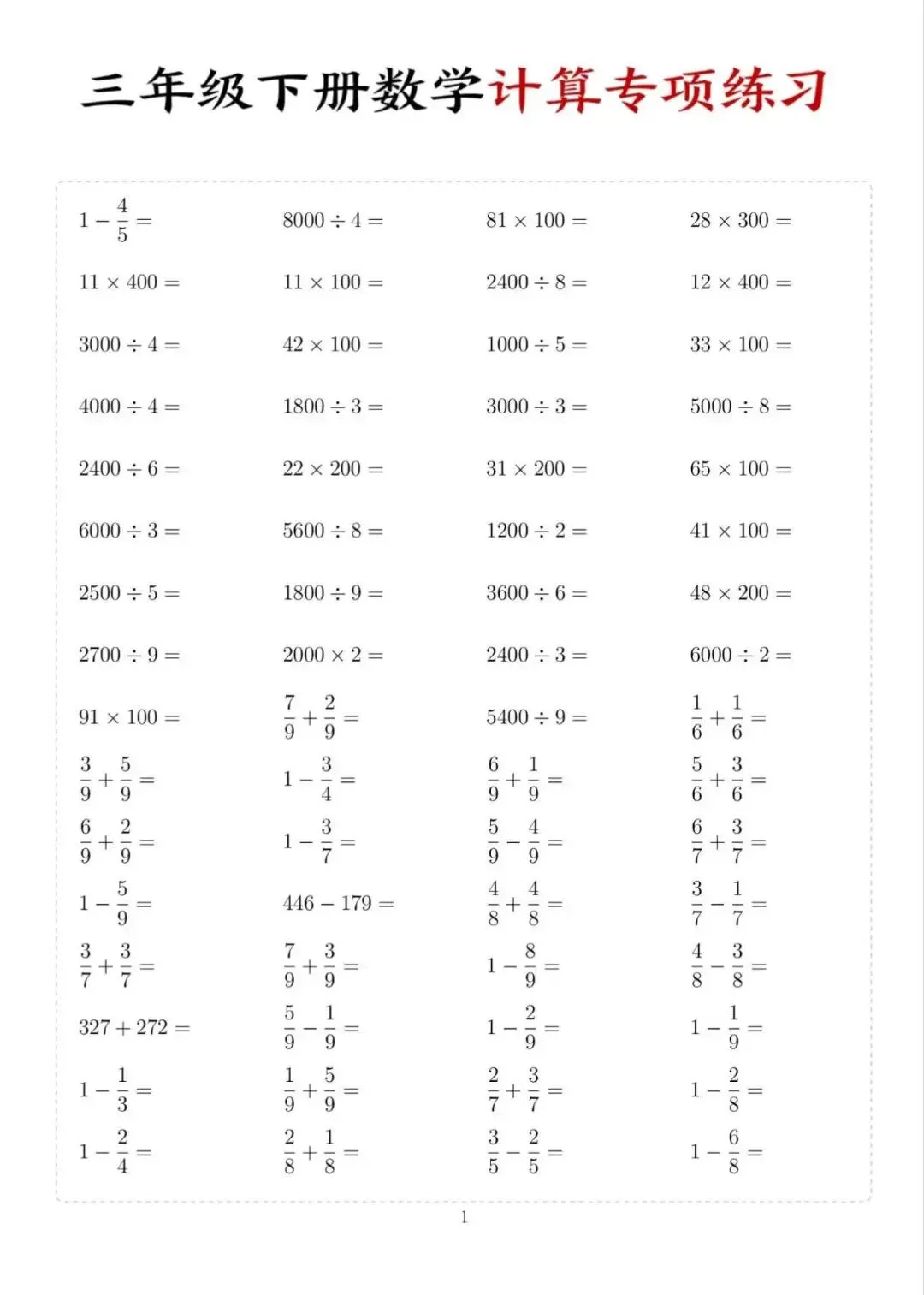 三年级下册数学计算专项练习,电子版可下载打印