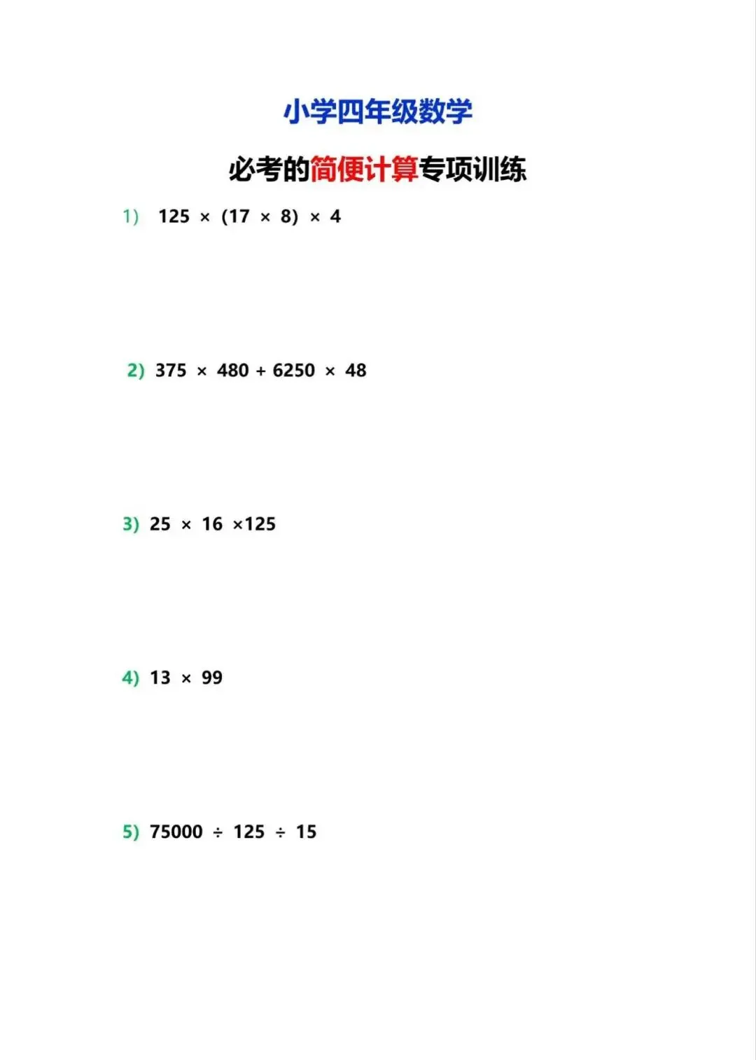 小学四年级数学必考的简便计算专项训练,电子版可下载打印