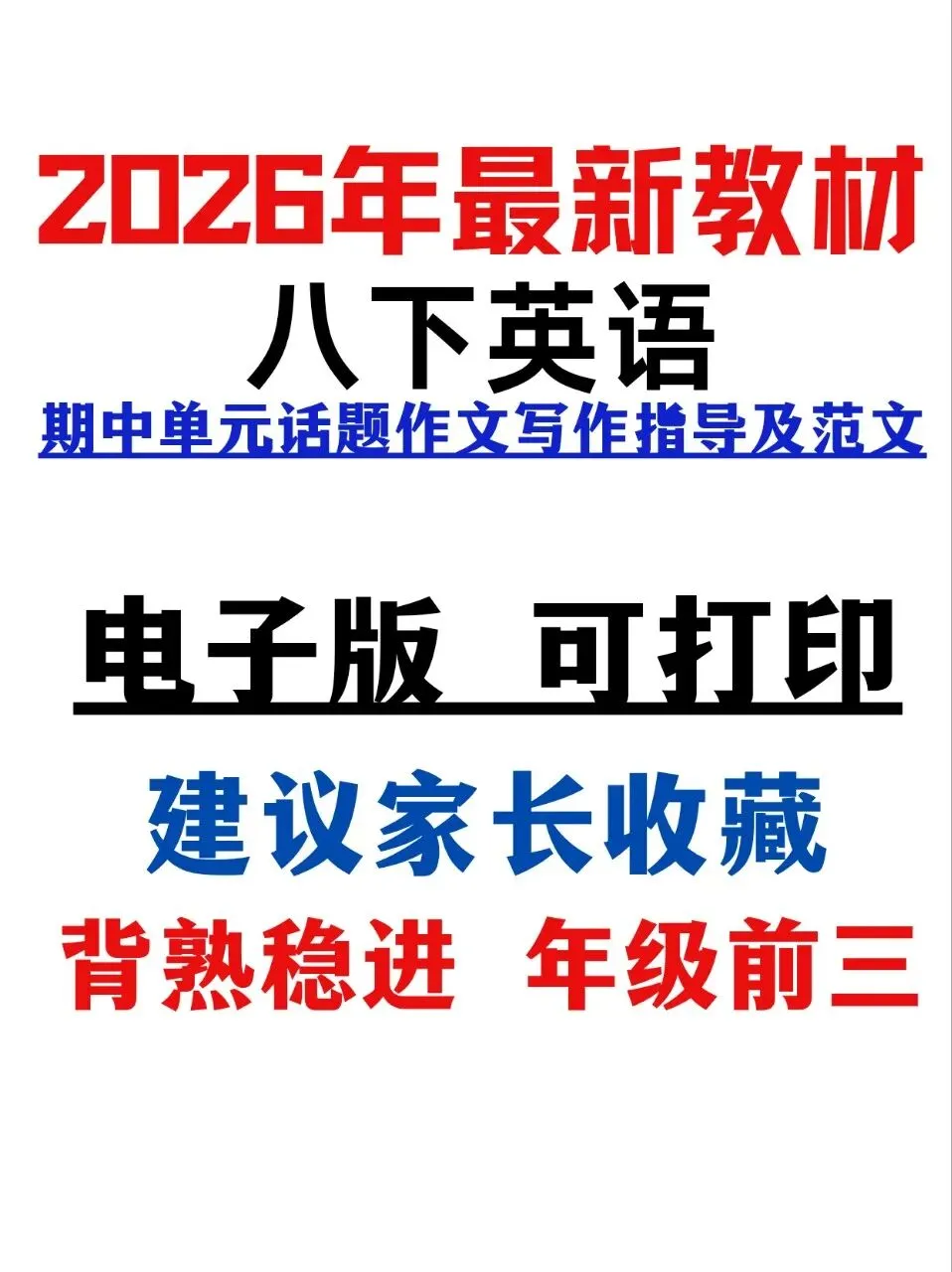 这份2026年最新版八下英语单元话题写作指导,完全同步教材,按单元整理好重点话题、写作思路、高分句型和标准范文。不用自己瞎琢磨,每一篇都可以直接背诵、仿写。