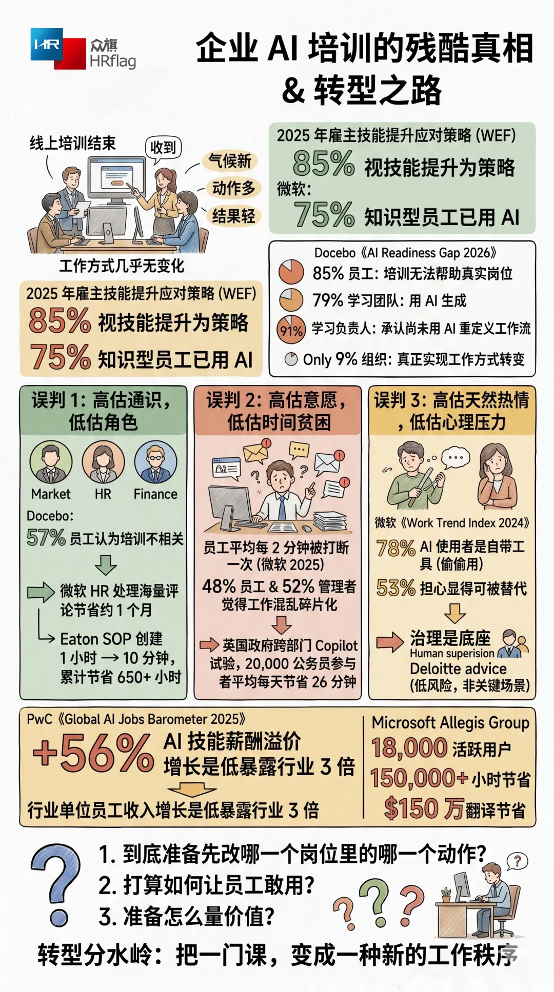 这并不是因为企业不重视。恰恰相反,AI已经成了管理层最不能回避的话题之一。世界经济论坛在《Future of Jobs Report 2025》中提到,到2030年,全球雇主预计有39%的核心技能会发生变化,85%的雇主把员工技能提升视为主要应对策略。与此同时,微软与LinkedIn的研究显示,75%的知识型员工已经在工作中使用AI,79%的管理者认为公司要保持竞争力就必须采用AI。换句话说,AI不是“要不要学”的问题,而是企业已经普遍相信,自己不能再等。