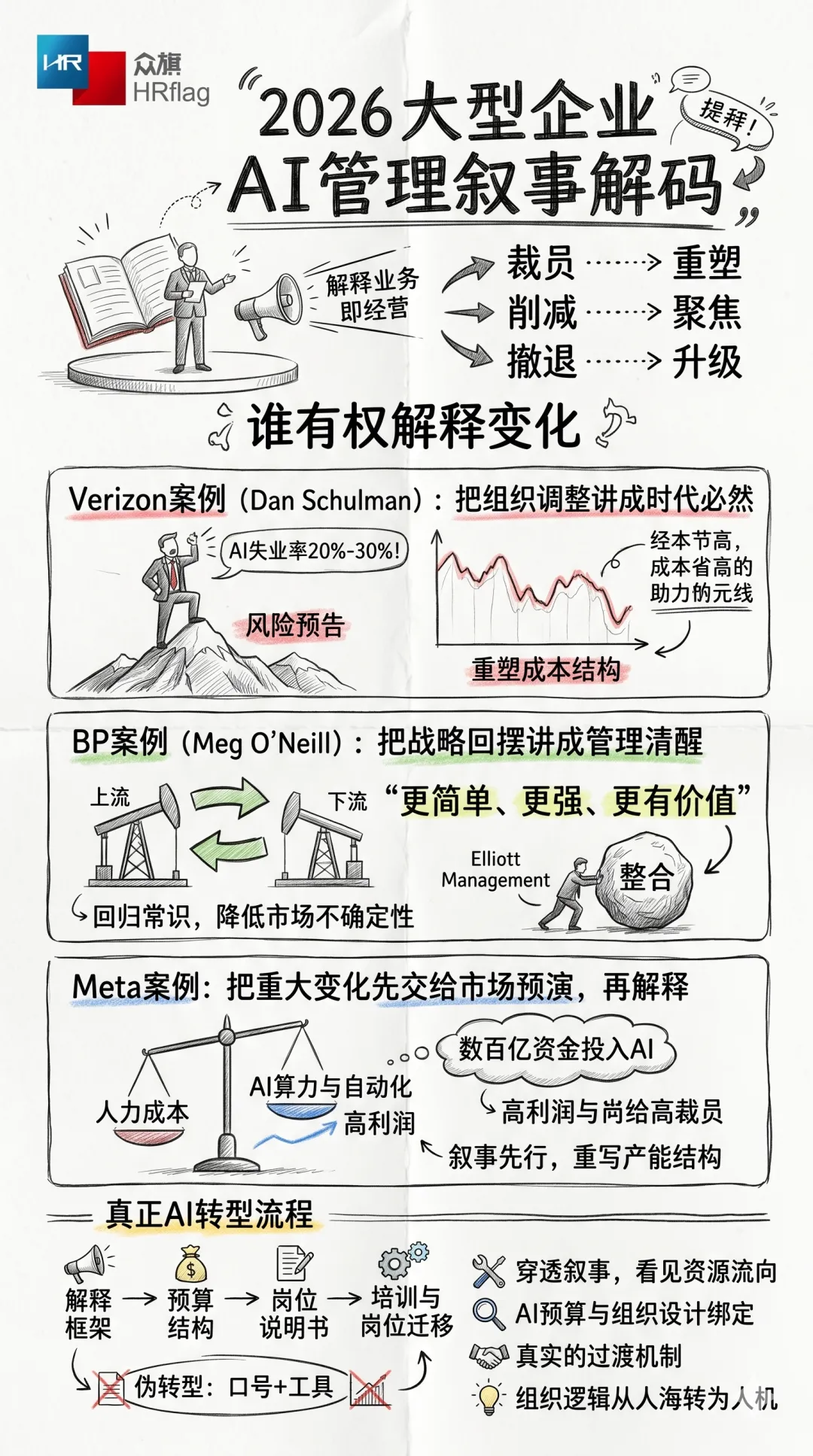 放在这个背景下,再看 Verizon、BP 和 Meta 这几个案例,就会发现它们最值得关注的地方,不在于谁说得更狠、谁动作更大,而在于它们分别代表了三种典型的企业叙事:一种是把组织调整讲成时代必然,一种是把战略回摆讲成管理清醒,一种是把重大变化先交给市场预演,再回到公司内部完成解释。它们不是三个孤立事件,而是 2026 年大型企业管理叙事的三个截面。