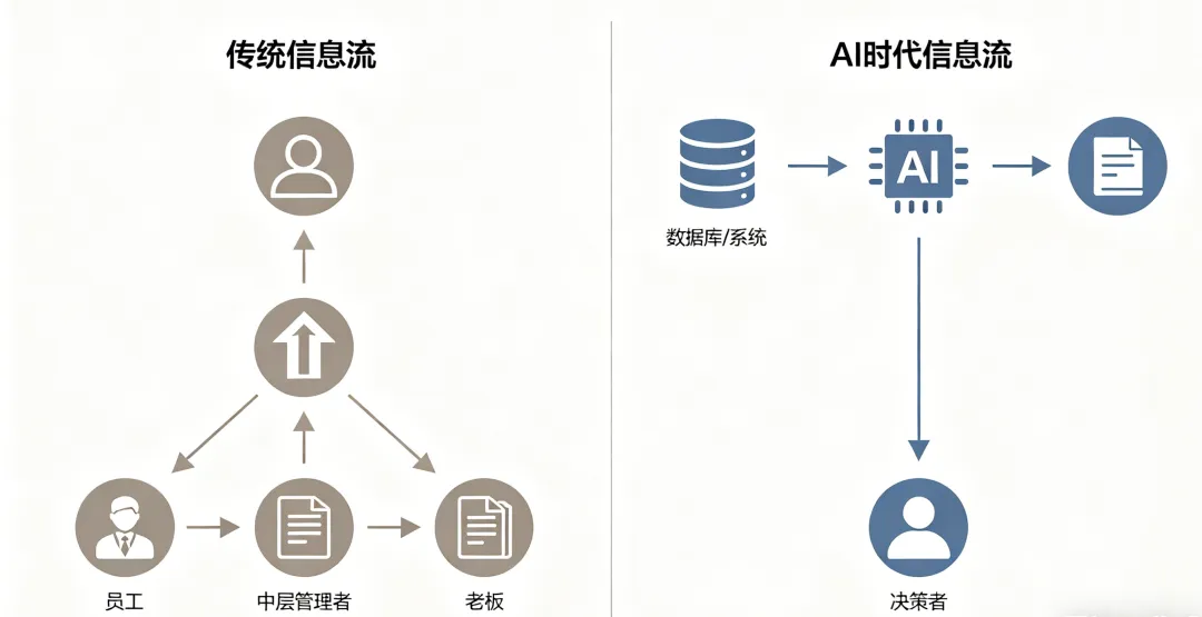 有一类中层的核心职能是:把上面的话翻译给下面,把下面的数据汇报给上面。这个角色,在 AI 实时感知数据、自动生成报告之后,确实会被压缩。这是客观趋势,不是危言耸听。