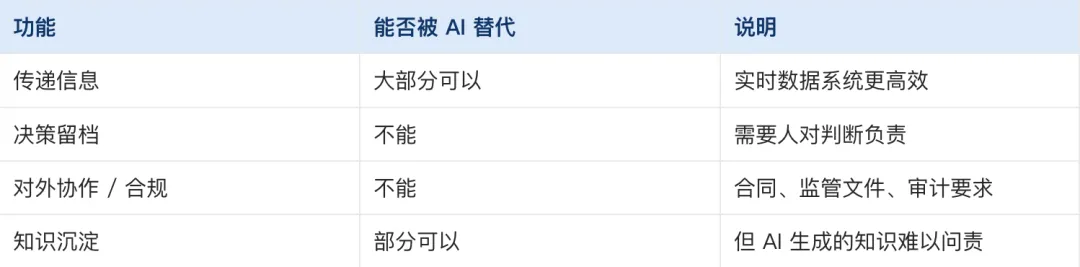 这些场景,AI 确实可以替代。当系统实时可读、AI 可以直接查看代码提交记录、数据看板、沟通记录,「把信息写成文档再传递」这个动作的必要性大幅下降。