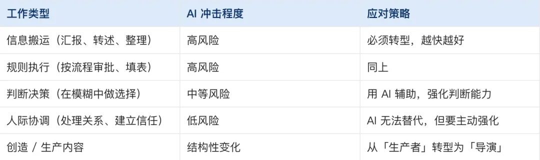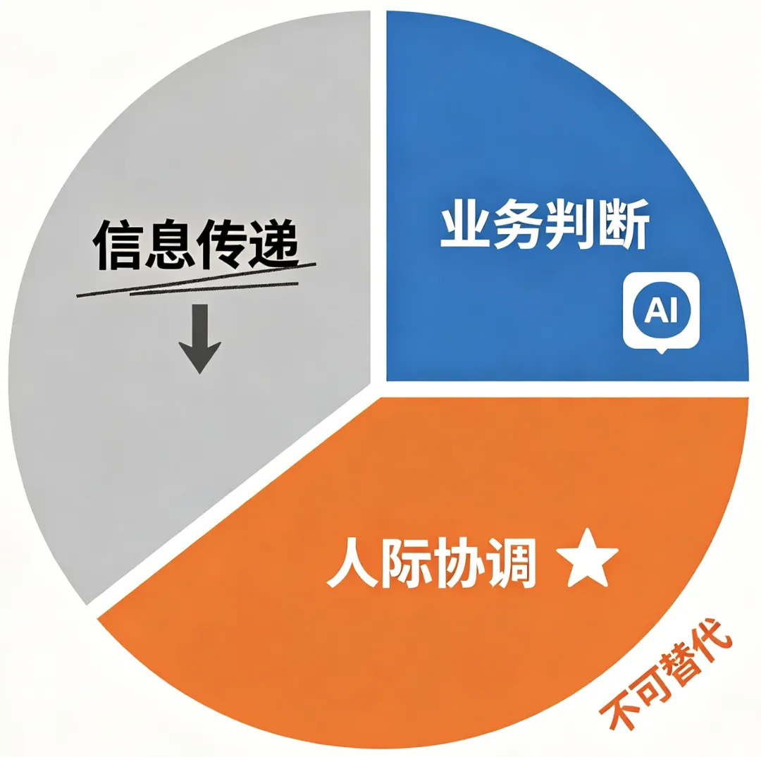 中层管理者做三件事:信息传递(正在消失)、业务判断(AI 辅助但无法替代)、人际协调(AI 完全无法替代)。