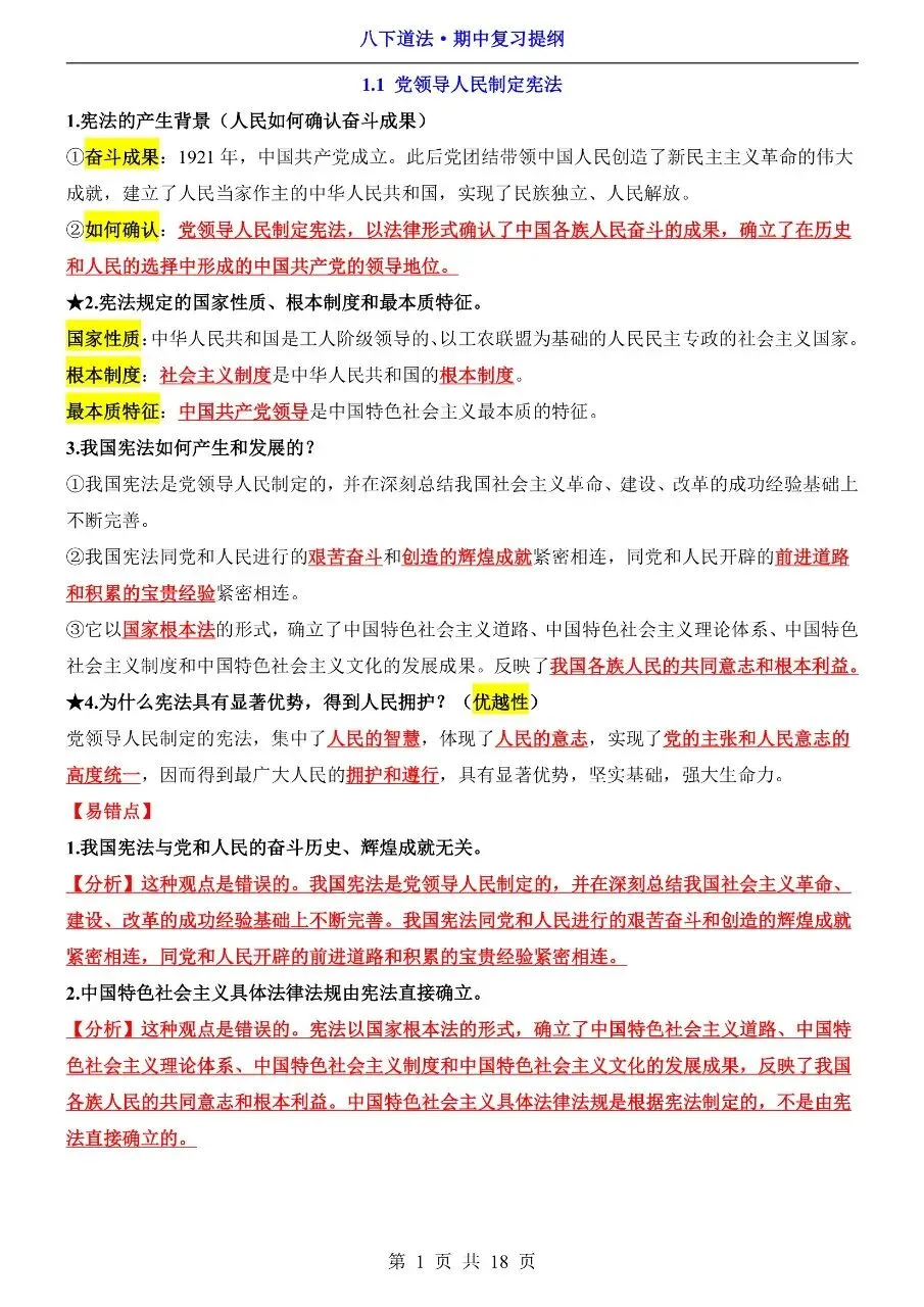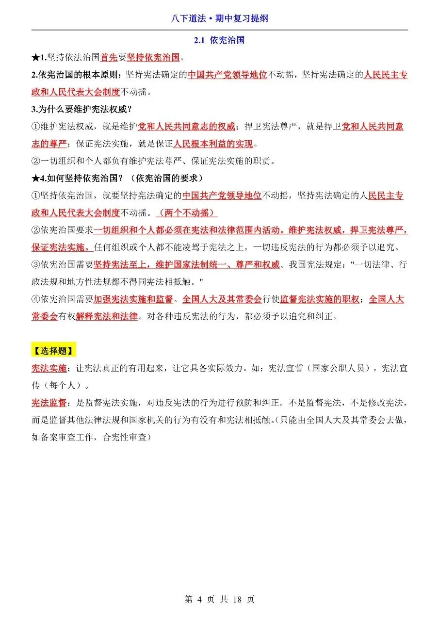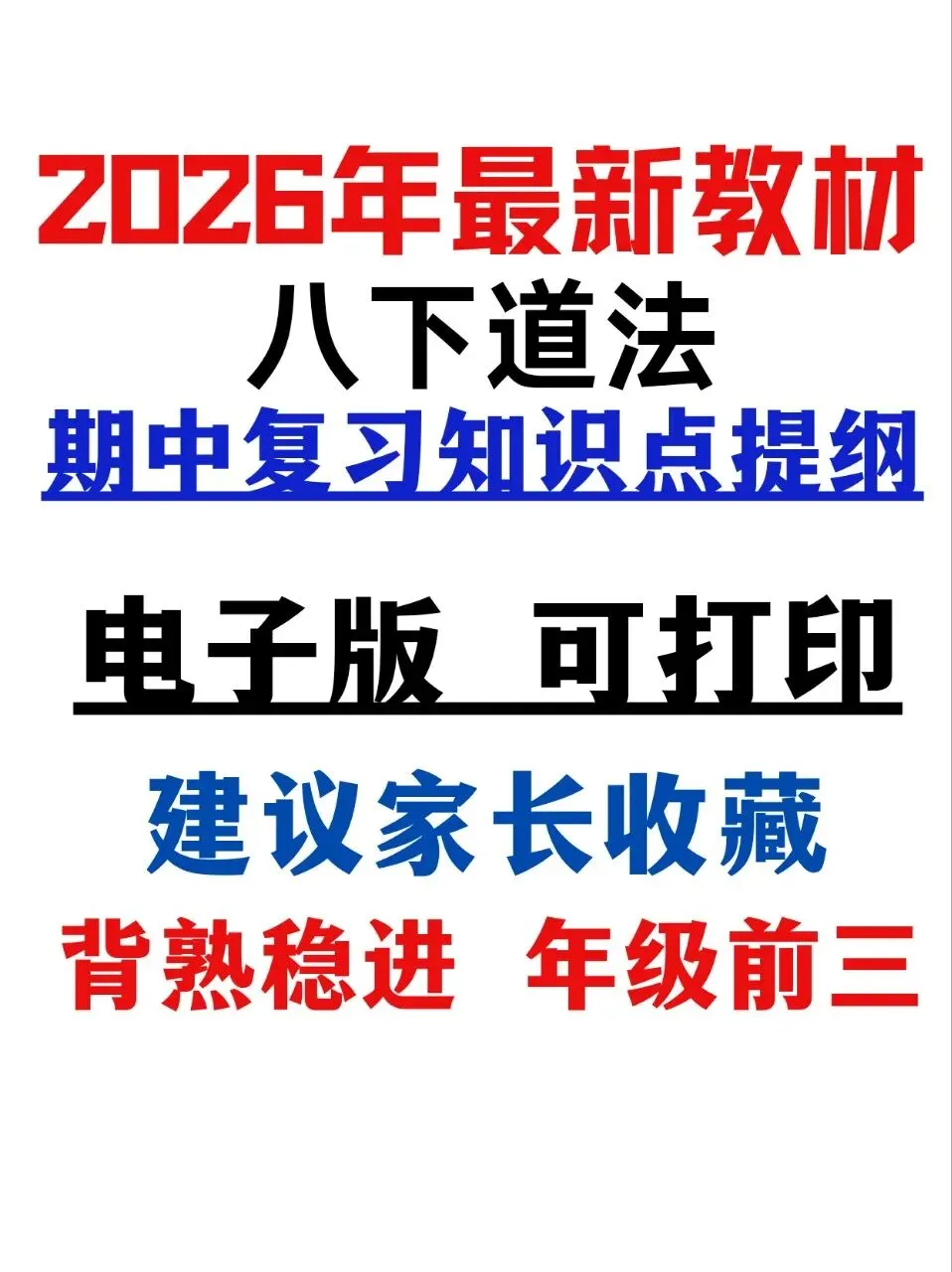 这份专为2026年教材整理的八年级下册道法期中复习提纲,完全贴合课本重难点与高频考点,不用再自己熬夜总结,直接拿来就能背。每一条都是核心得分点,覆盖选择题、材料题必考内容,基础扎实、难点清晰,考前过一遍,思路立刻清晰。