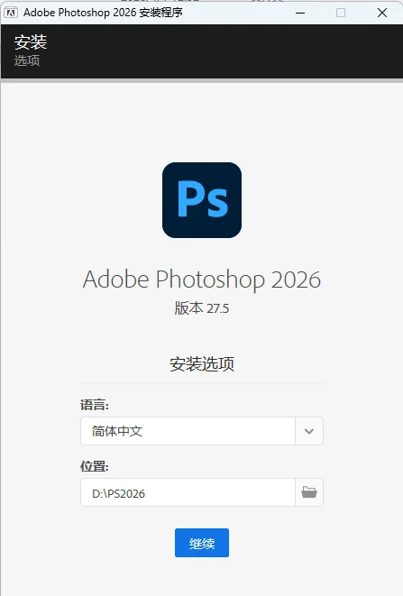 4.修改安装位置:①点击需要将软件安装的磁盘位置(如:D盘)②新建一个【PS2026】文件夹并选中③点击【确定】。