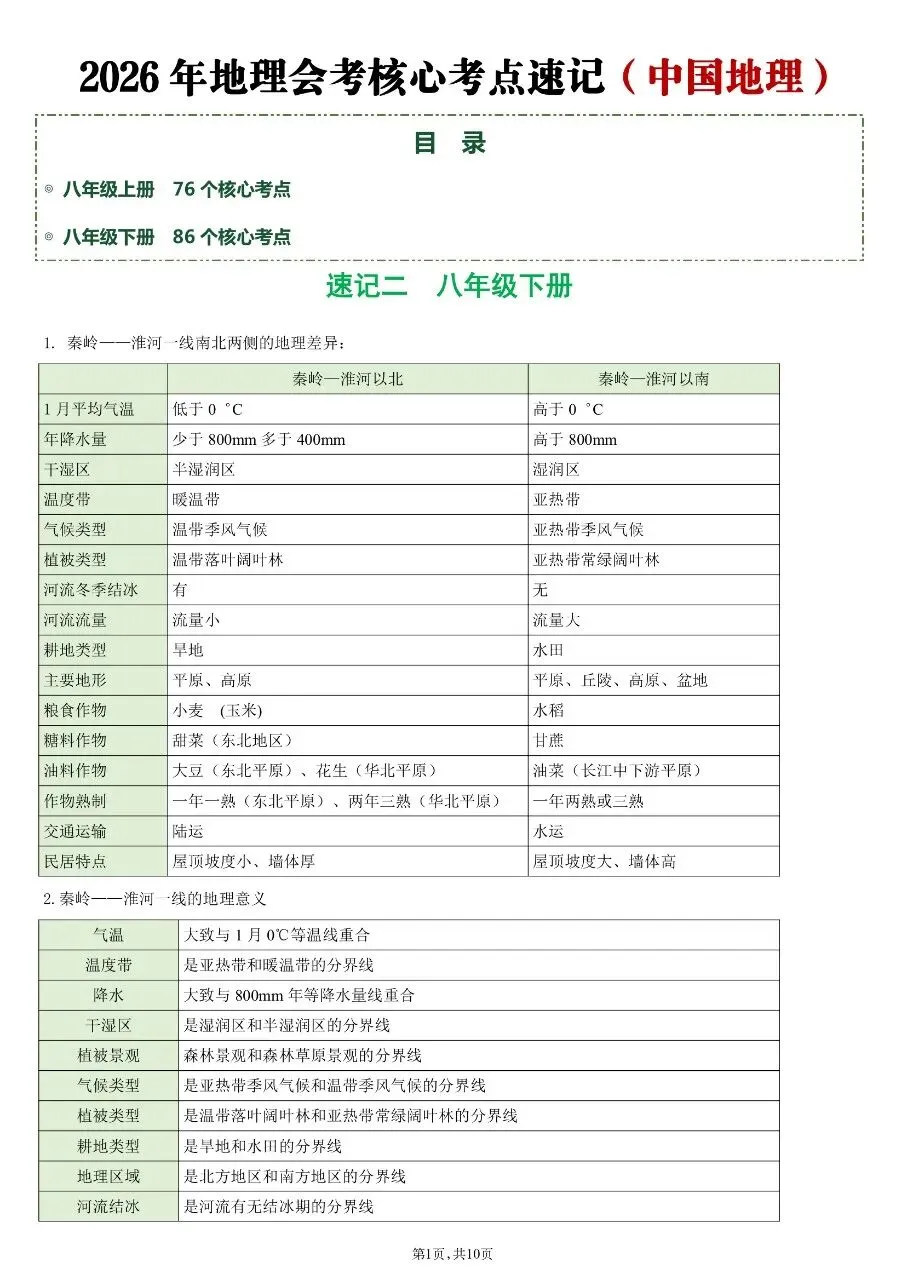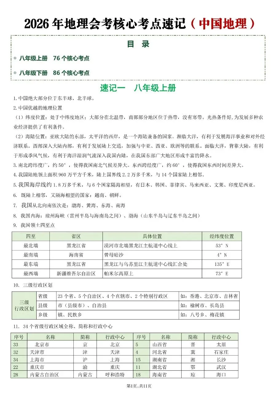 2026年最新版地理会考全册核心考点速记,有完整电子版可打印,学霸学习好帮手,建议家长打印,学霸人手一份!