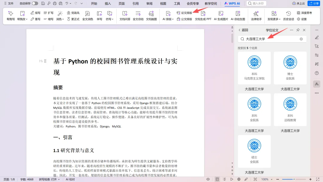点击WPS界面的「论文排版」功能入口,在右侧搜索栏输入「大连理工大学」,即可查看所有官方发布的论文模板,选择匹配的模板后即可启动AI排版。