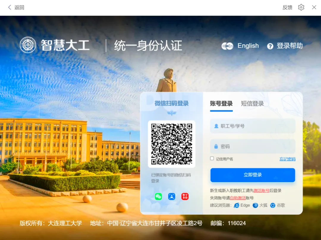 在跳转的页面中输入学校代码「DLUT」,系统将自动跳转至大连理工大学统一身份认证界面。