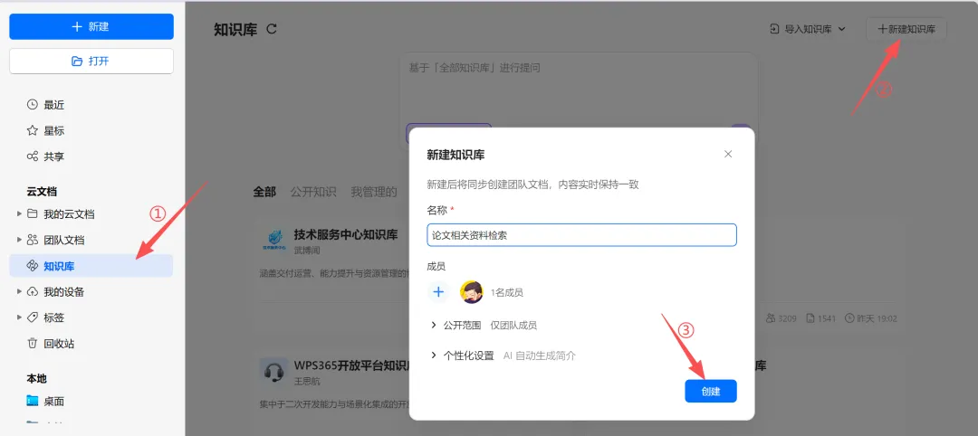 只需三步即可搭建个人/团队知识库,如团队共享知识库,则可以添加成员。