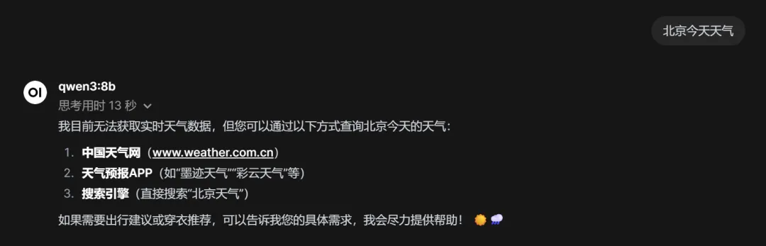 还是采用本地方案:Ollama+Qwen+OpenWebUI,来写一个查询天气的函数,本地模型直接询问天气的话,它不会查,它会告诉你怎么查,需要自己手动去查。