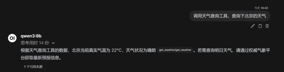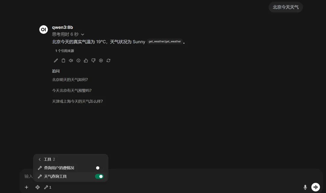 之后我们新开一个会话,在聊天框的扩展功能下,将我们的天气查询工具选中,以供模型调用,此时再询问天气情况,模型会调用我们的代码将结果返回,效果如下图: