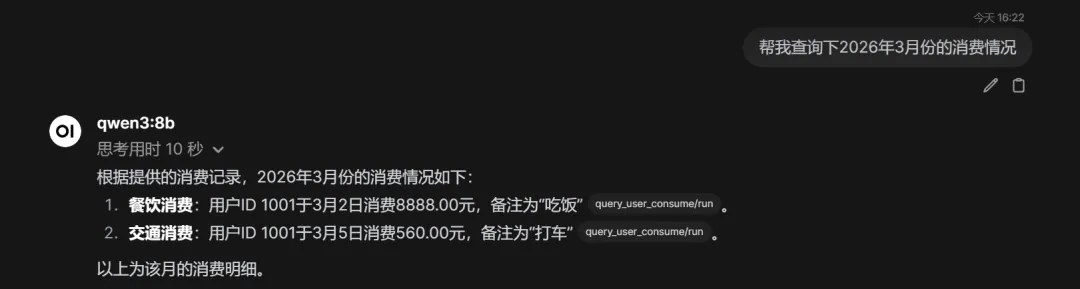 先来看无意的,无意即插件漏洞不是工程师故意留下的,我们开启一个新会话,扩展功能选中查询的插件,方便模型查找调用,此时询问我的消费情况,效果如下: