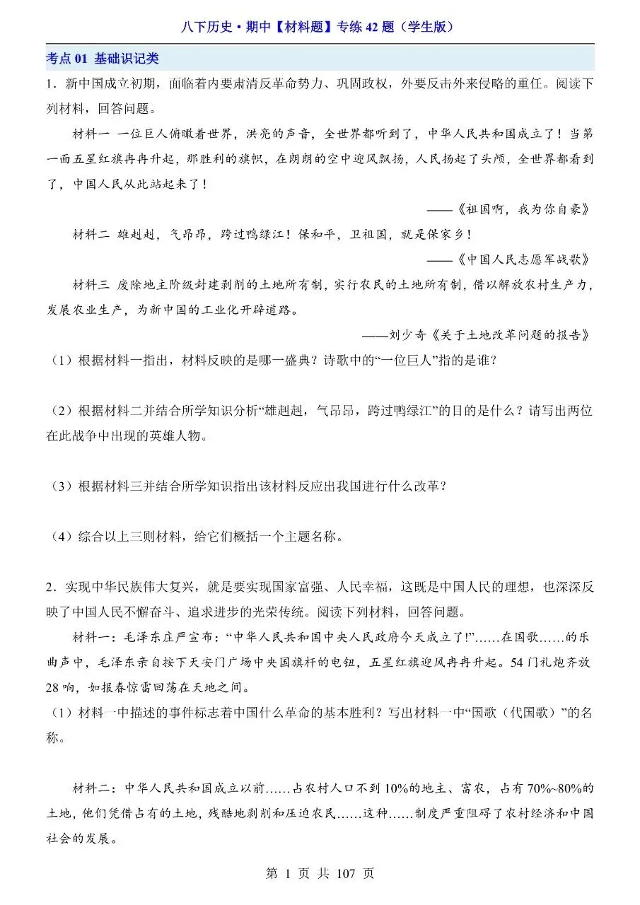 很多同学一碰到历史材料题就头疼,看不懂材料、抓不住要点、答题没思路,考试白白丢分。这份专门针对八年级下册历史的期中复习材料题,一共42道,全是按照最新教材考点整理,覆盖期中高频考点、核心设问,不用自己再瞎找题、瞎总结。