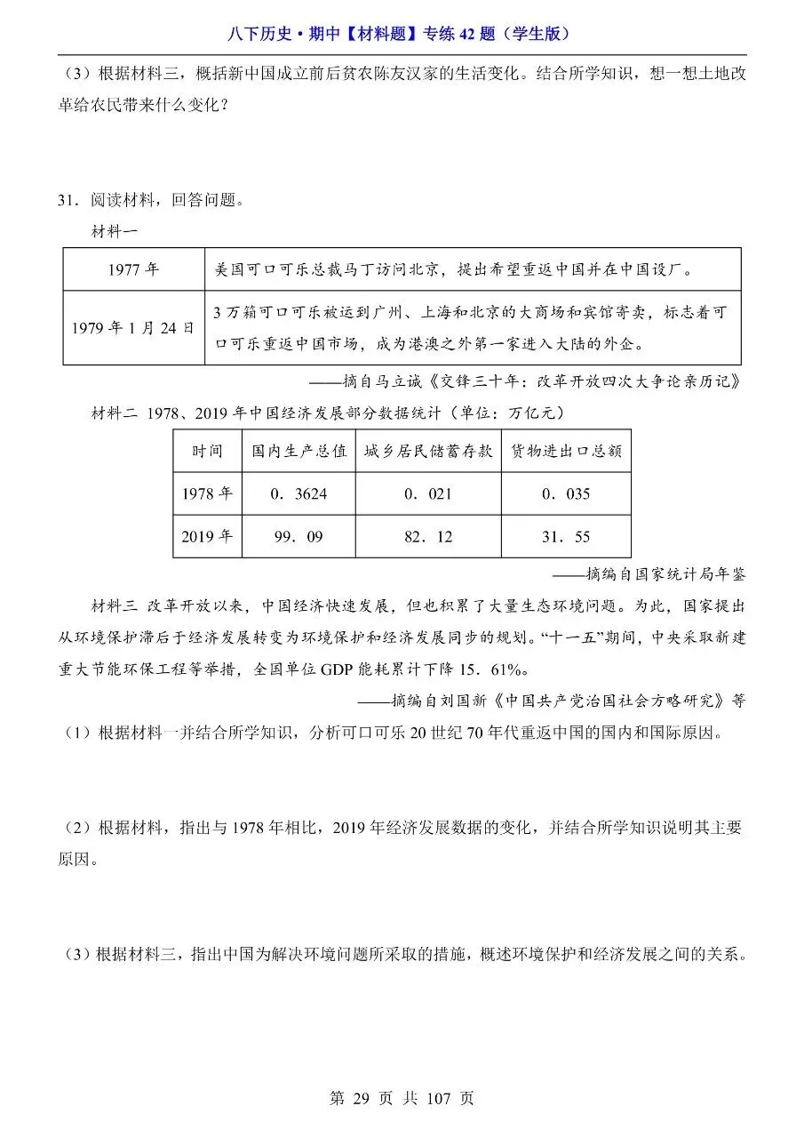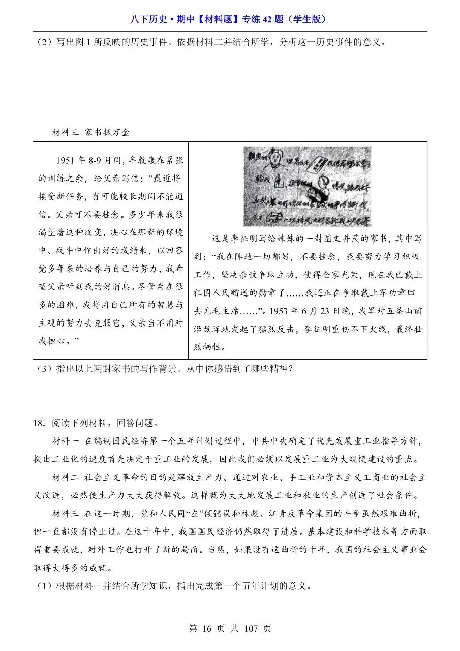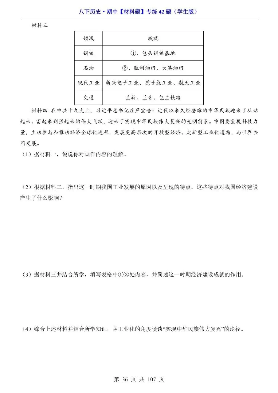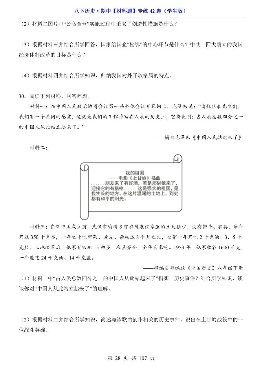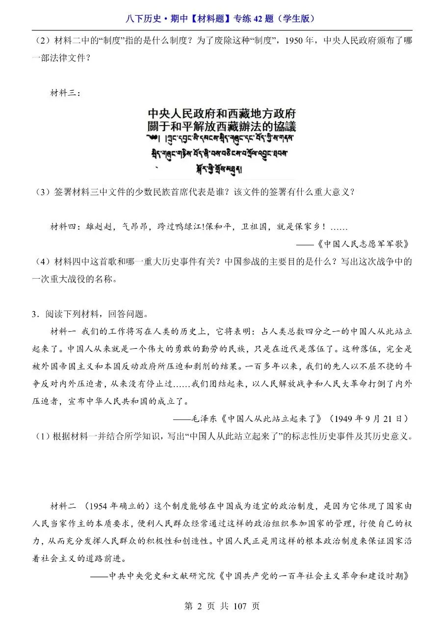 2026年最新版八年级下册历史期中复习材料题专练42道,有完整可打印,学霸学习好帮手,建议家长打印,学霸人手一份!