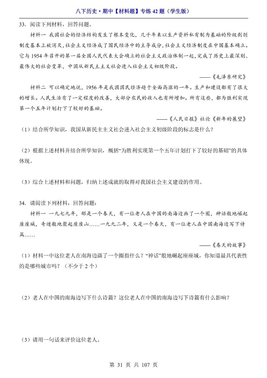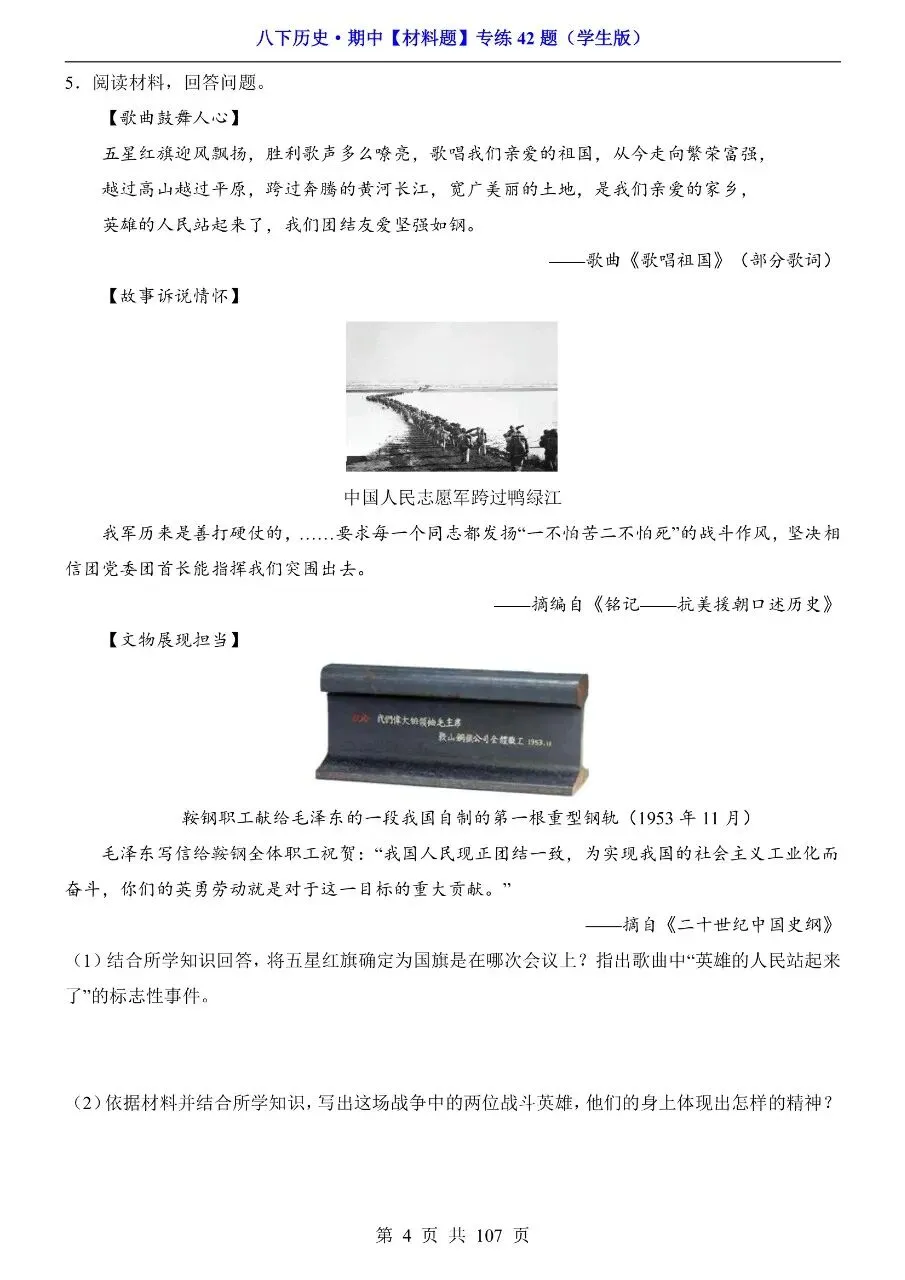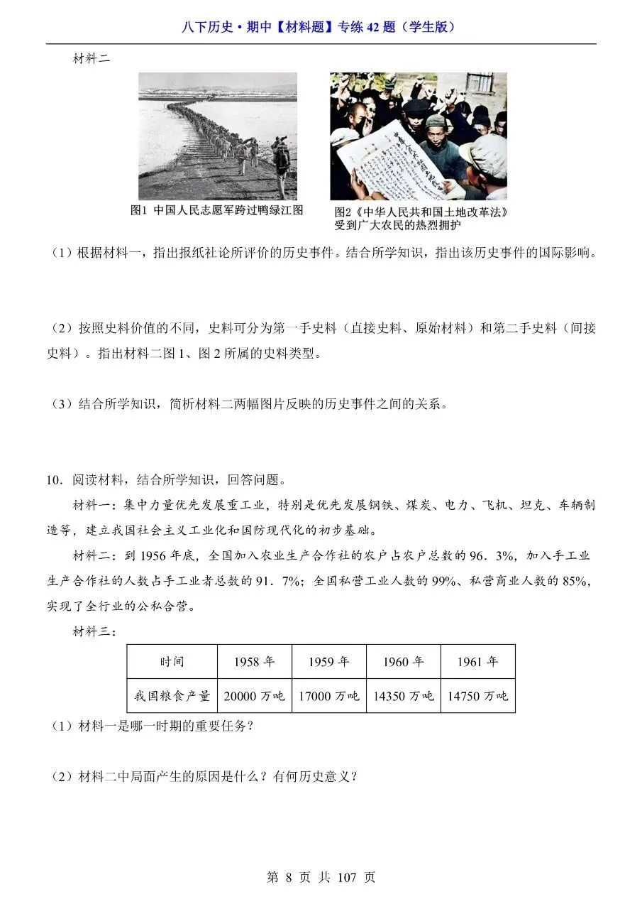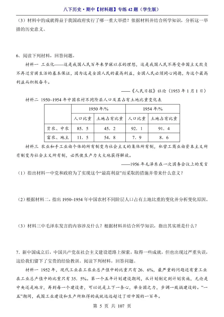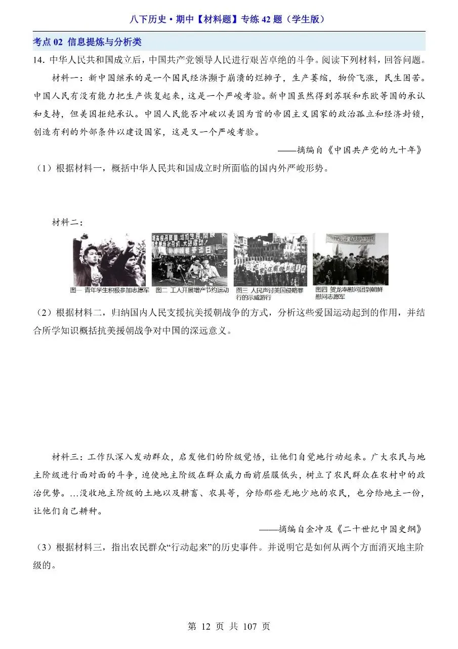 2026年最新版八年级下册历史期中复习材料题专练42道,有完整可打印,学霸学习好帮手,建议家长打印,学霸人手一份!