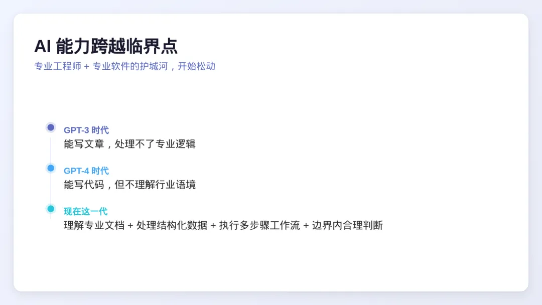这个临界点意味着:AI 开始有能力把过去沉淀在「专业工程师 + 专业软件操作」里的隐性流程,拆出来、学进去,然后绕过去。