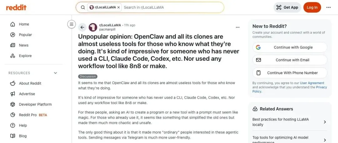 这事就发生在 Reddit 的 LocalLLaMA 板块。一个用户上来就丢了个“不讨喜的观点”,直接开喷。他说,“OpenClaw 和所有它的克隆体,对于那些知道自己该做什么的人来说,几乎是没用的工具。” 这话说出来,等于直接否了一大票围绕 OpenClaw 生态的开发者。