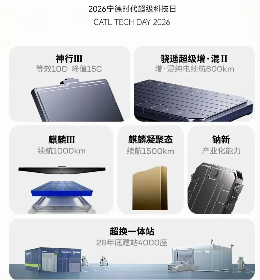 3、4月21日,宁德时代2026超级科技日,以”极域之约”为主题,集中发布五大电池技术与超换一体补能网络,通过多化学体系协同实现续航、补能、安全等领域的全面突破;