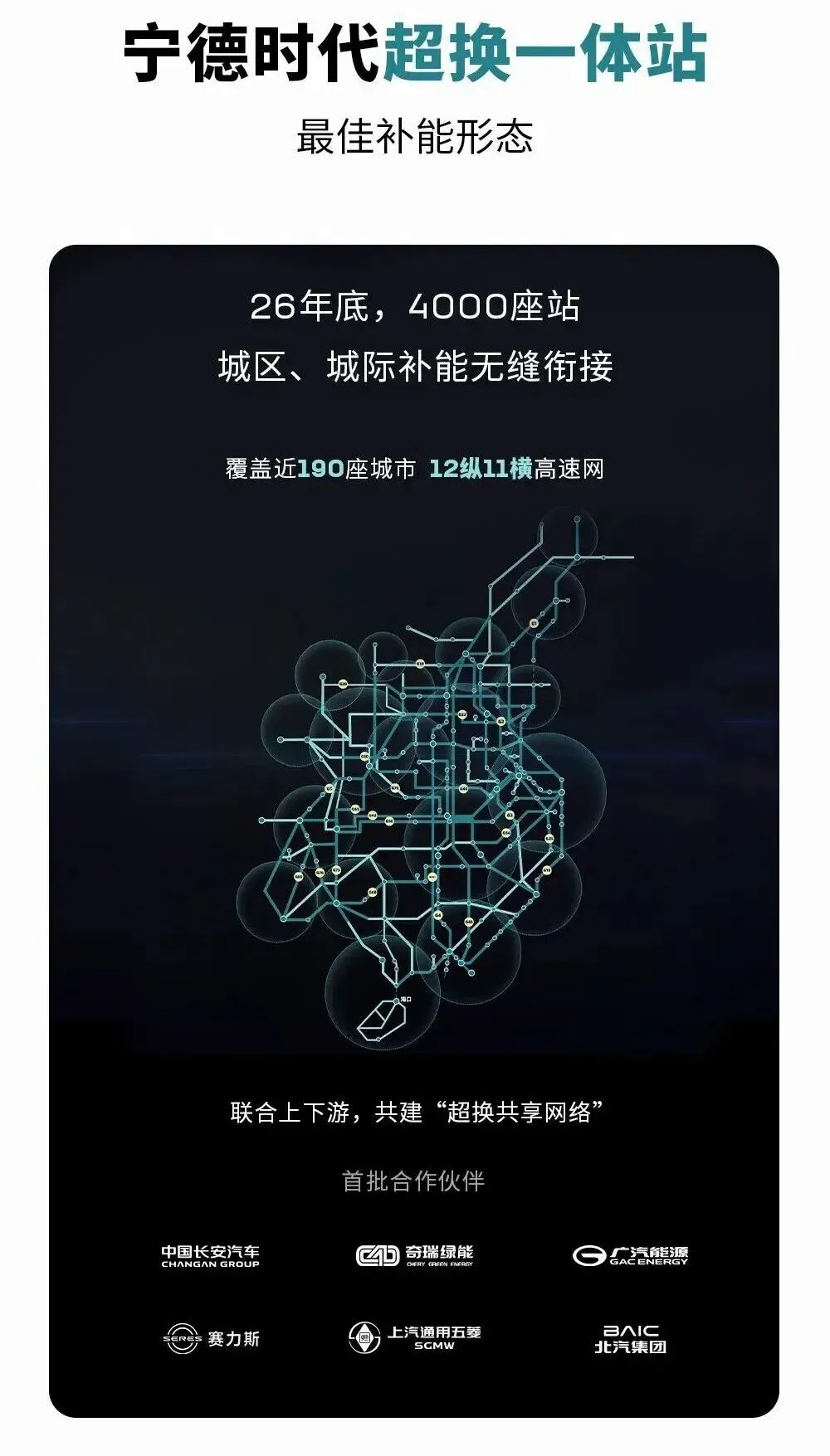 超换一体网络:融合超充桩与换电站,支持99秒极速换电,已覆盖190城及12纵11横高速,2026年底目标4000座,2028年扩至10万座;