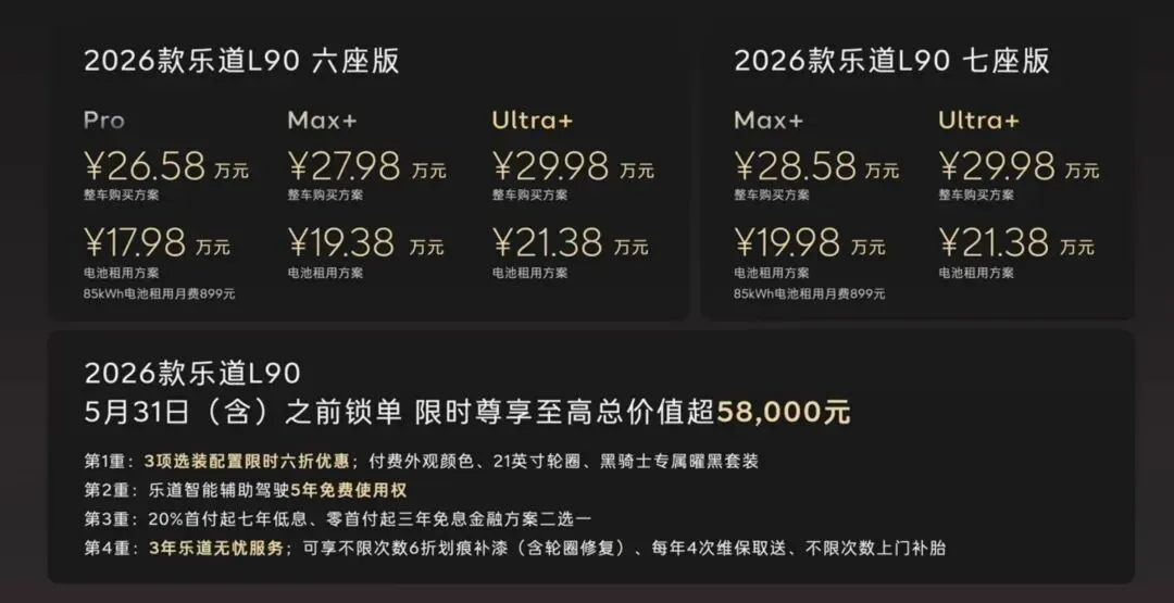 5、4月21日,2026款乐道L90正式上市,六座/七座与Pro、Max+和Ultra+组合共五版配置,整车购买售价26.58-29.98万元,采用BaaS电池租用方式售价17.98-21.38万元,5月底前锁单尊享至高价值5.8万元五重权益,蔚来公司老车主享专属复购权益;