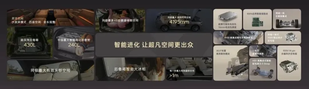 性能与底盘:升级为900V高压架构,115度6C麒麟电池+双电机四驱版,CLTC续航达720km,SOC 10%-80%快充仅需10分钟;搭载浩瀚AI数字底盘,升级闭式双腔空气悬架+双阀CCD电磁减振器;