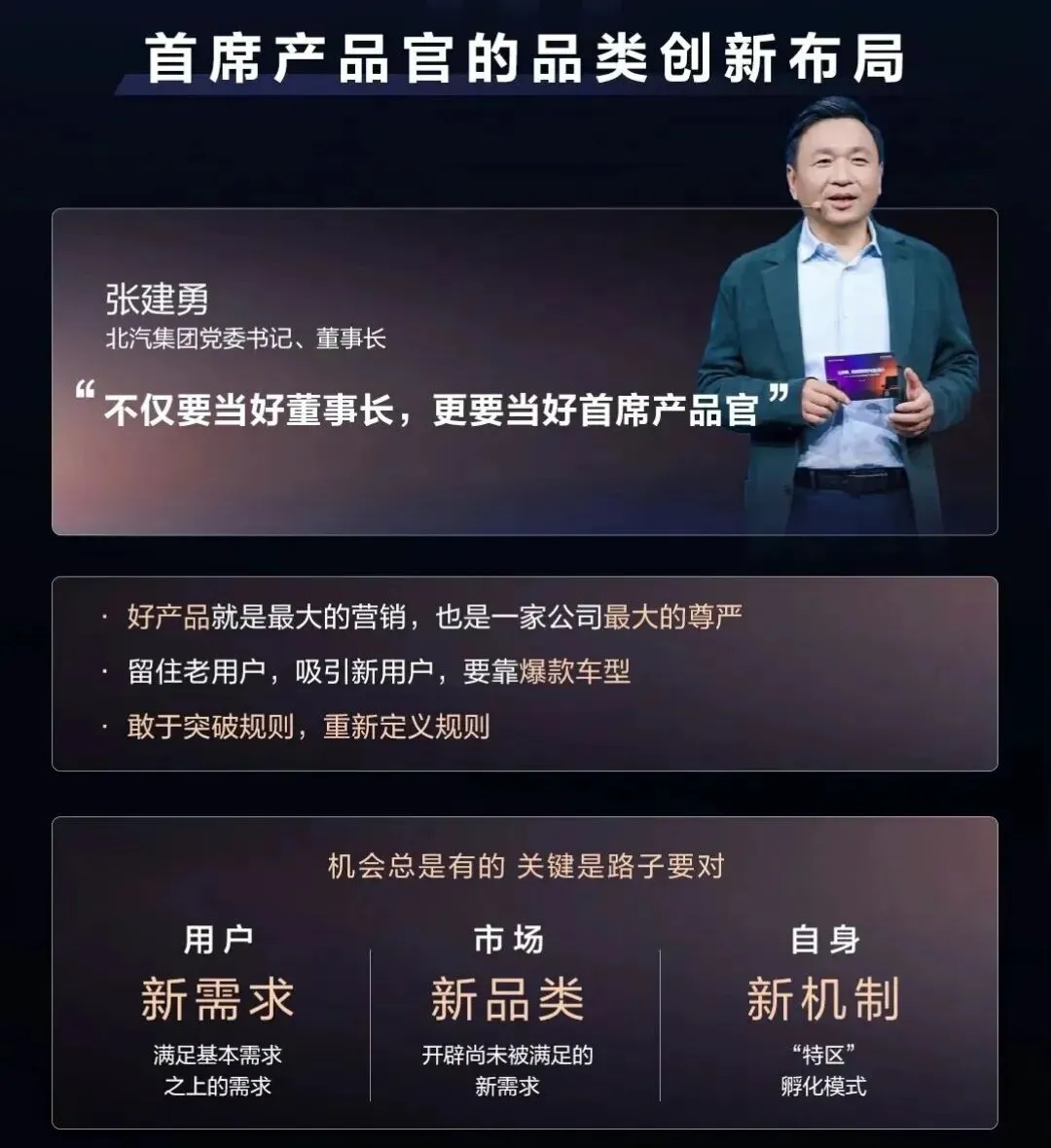 北汽集团董事长张建勇亲自担任首席产品官,体现北汽从“闭门造车”向“用户定义产品”的转变,推动组织级用户直连与快速迭代机制。