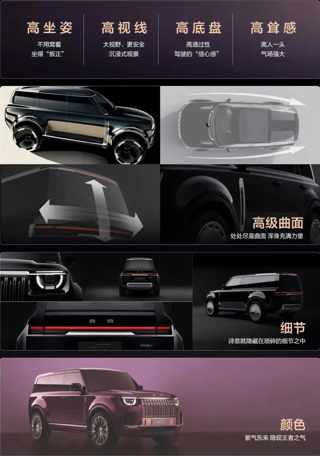 北京·城市猎人 定位“高姿态SUV”,主打“5天城市通勤、2天郊游、7天长途穿越”的全场景高端出行需求,强调“大硬小软”设计哲学与“骨相美不如皮相美”的审美逻辑,追求高坐姿、高视野、高通过性的豪华气场;