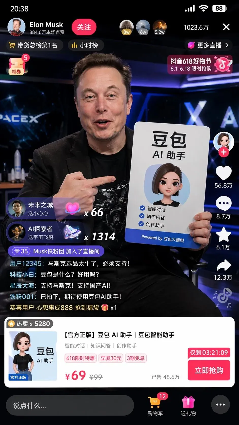 我在测试时输入了一句极简的中文指令:帮我画一个马斯克在抖音直播带货豆包的截图。