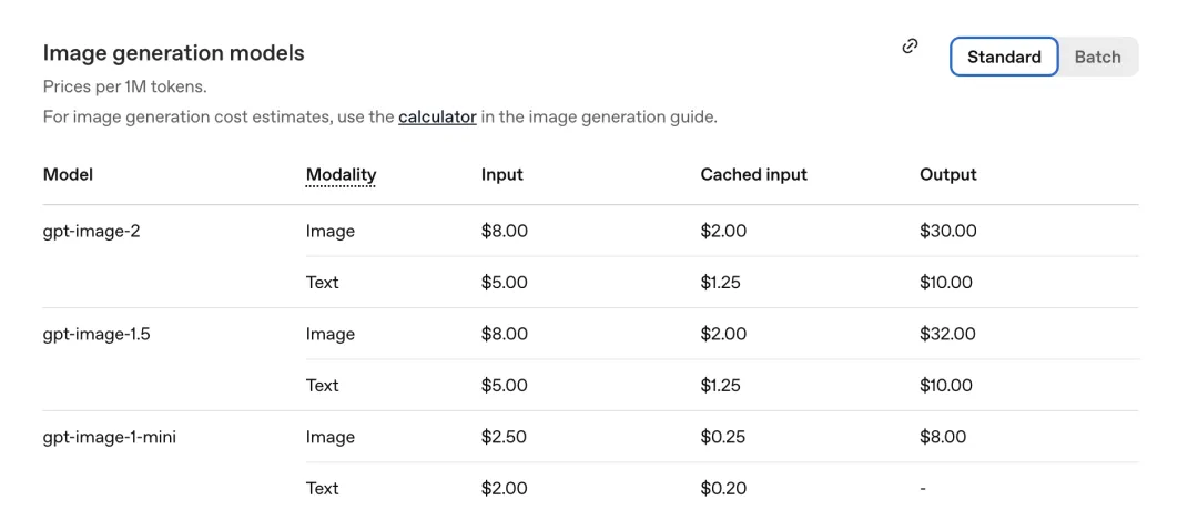 GPT-Image-2 图像部分:输入 8.00,缓存输入(Cachedinputs)2.00,输出 $30.00。