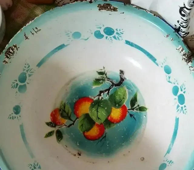 这个蓝边大盆,简称搪瓷脸盆,上头画的基本少不了桃子、苹果、花篮**,用来洗脸洗脚洗衣全能,摔两下响声震天**,家有小孩的永远在炕头见它,盆边掉漆,一看就知道是老物件,就是这块盆,盛过澡水,泡过脚,也端回炖面条,铁盆的命够硬。