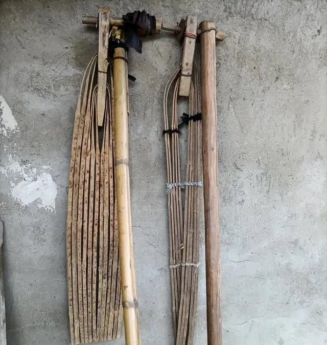 右侧这串竹条家伙,被叫做连枷,谷场脱粒的主力**,竹身早就被汗水和粮浆磨得发亮**,中间一根粗柄,前头绑着几根竹片,架轴一抡,地上麦子啪啦啦响,爷爷说这活干得腰直不起,还得盯紧小孩,防着打着脚,那一回场下来,背心全湿透,满身谷糠。