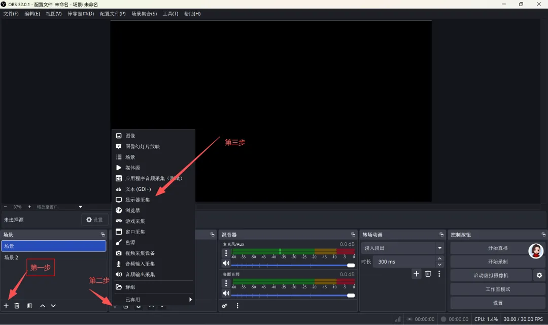 1.新建场景,添加「屏幕捕获」来源,选中需要录制的 PPT / 桌面画面