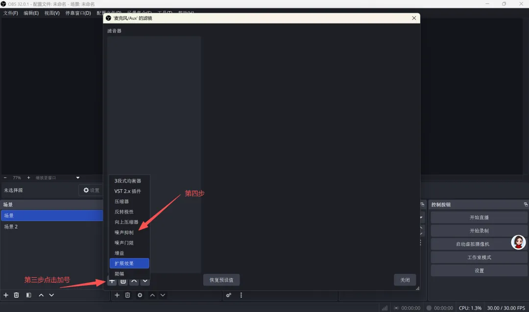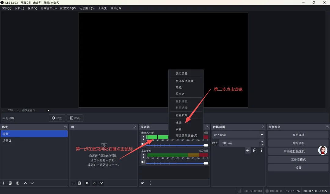 2.混音器调试麦克风、系统音量,开启音频降噪