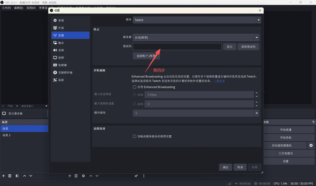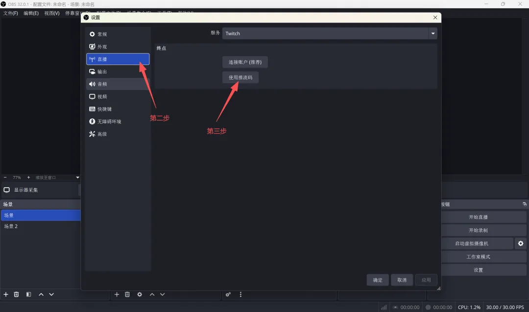 1.从直播平台复制推流地址与密钥,粘贴到 OBS 推流设置中