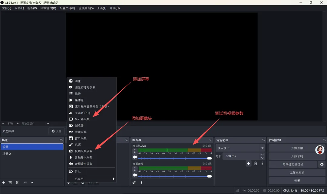 2.添加屏幕、摄像头等直播素材,调试音视频参数