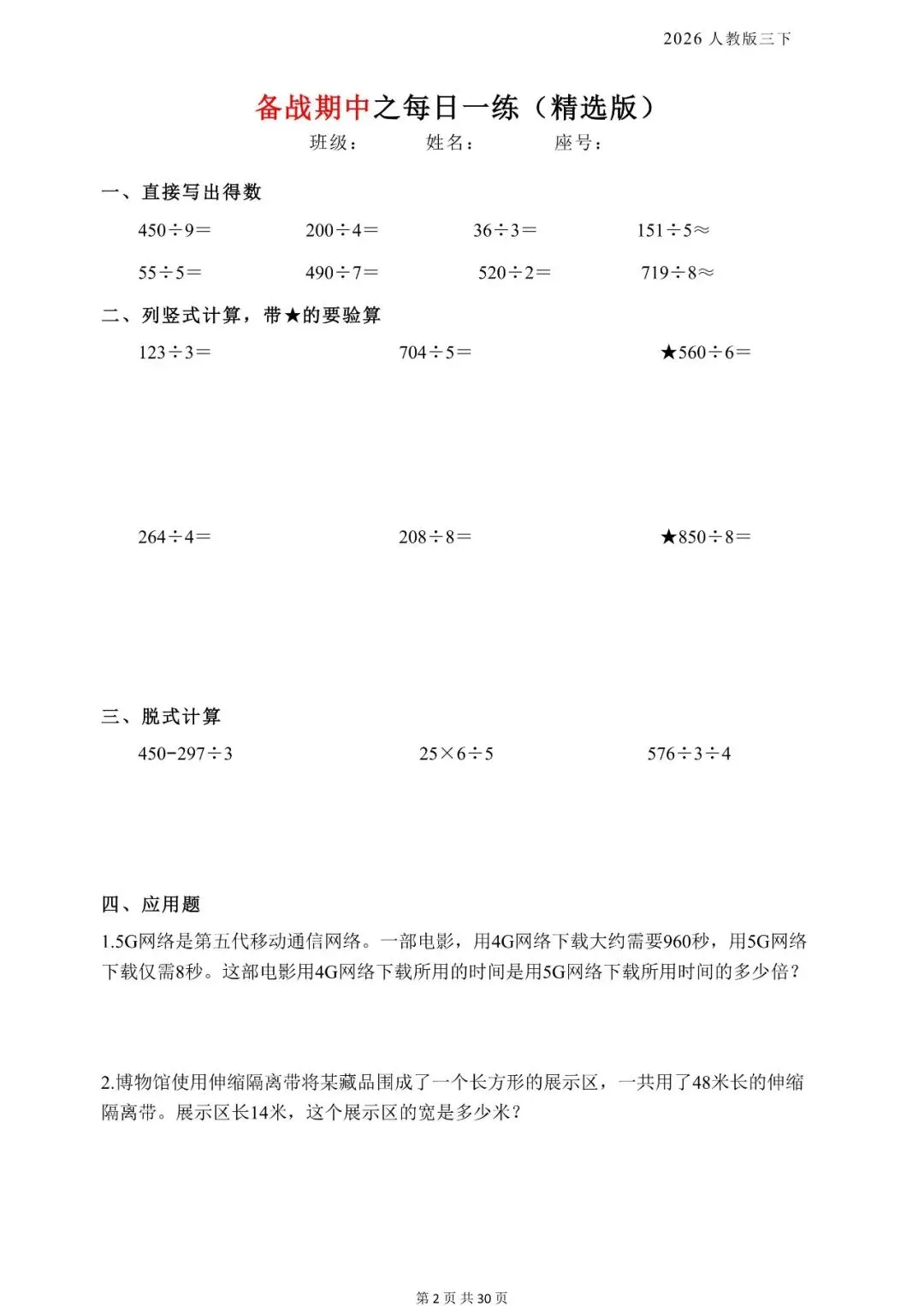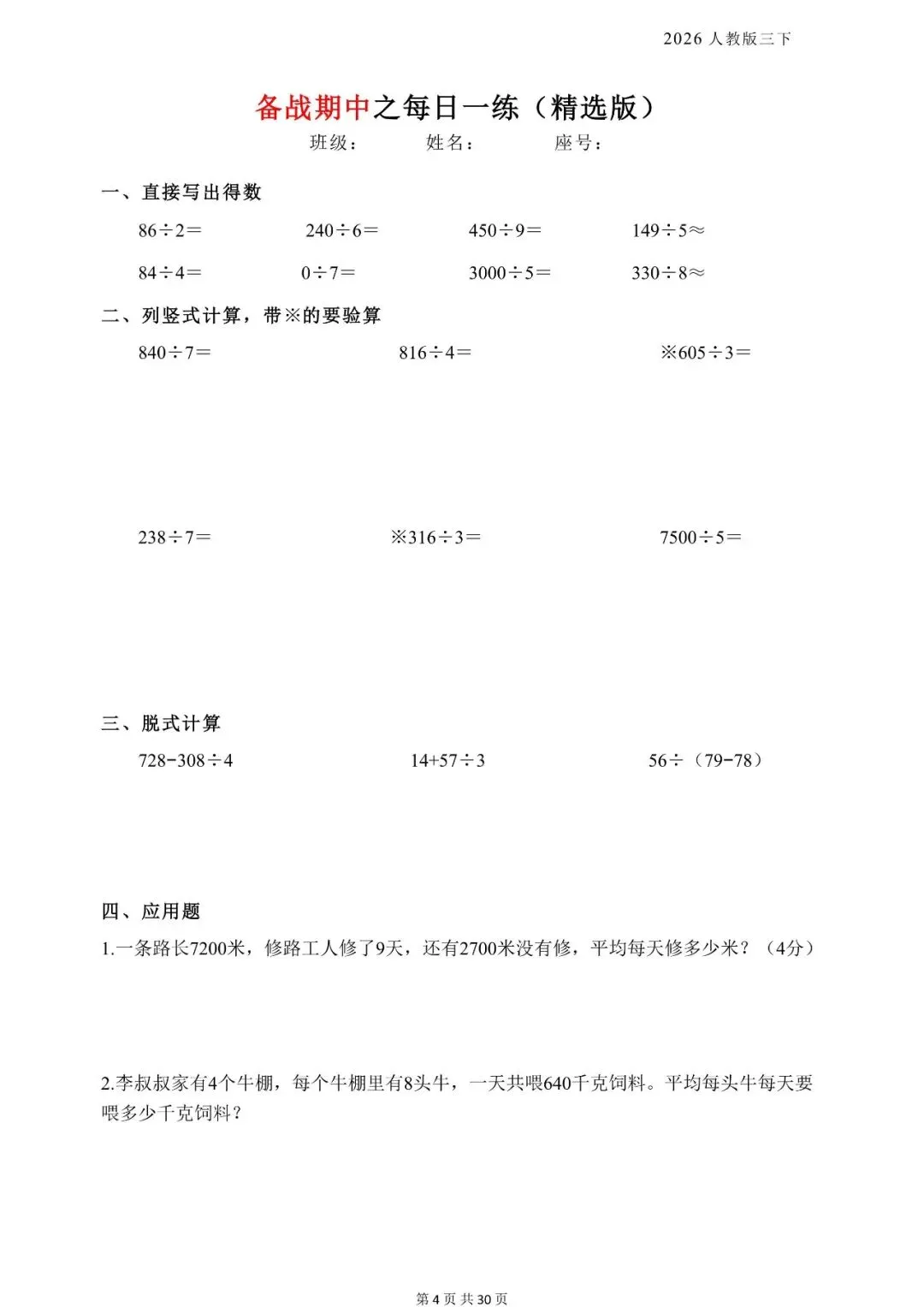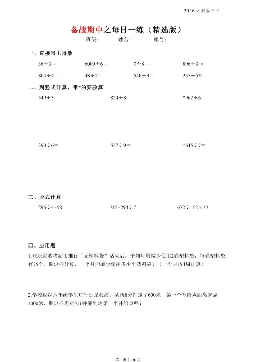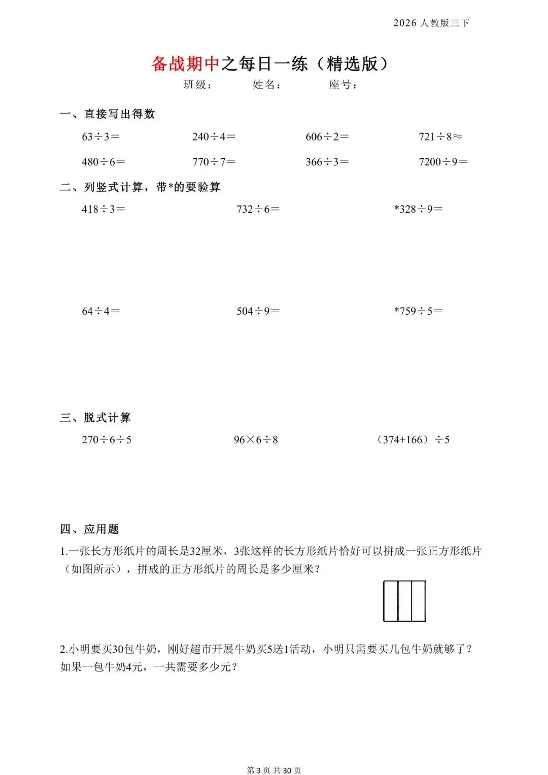 新版三年级下册数学《每日一练》,电子版可打印 今天晴天妈妈爱学习;给大家分享:新版三年级下册数学《每日一练》,电子版可打印每天持续分享更多的优质学习资料。 以下为部分截图,具体看完整PDF文件 (温馨提示:文末有电子版领取方式) 完整电子版: ①:在公众号对话框中回复:3811 (不是在“留言”中发数字)
