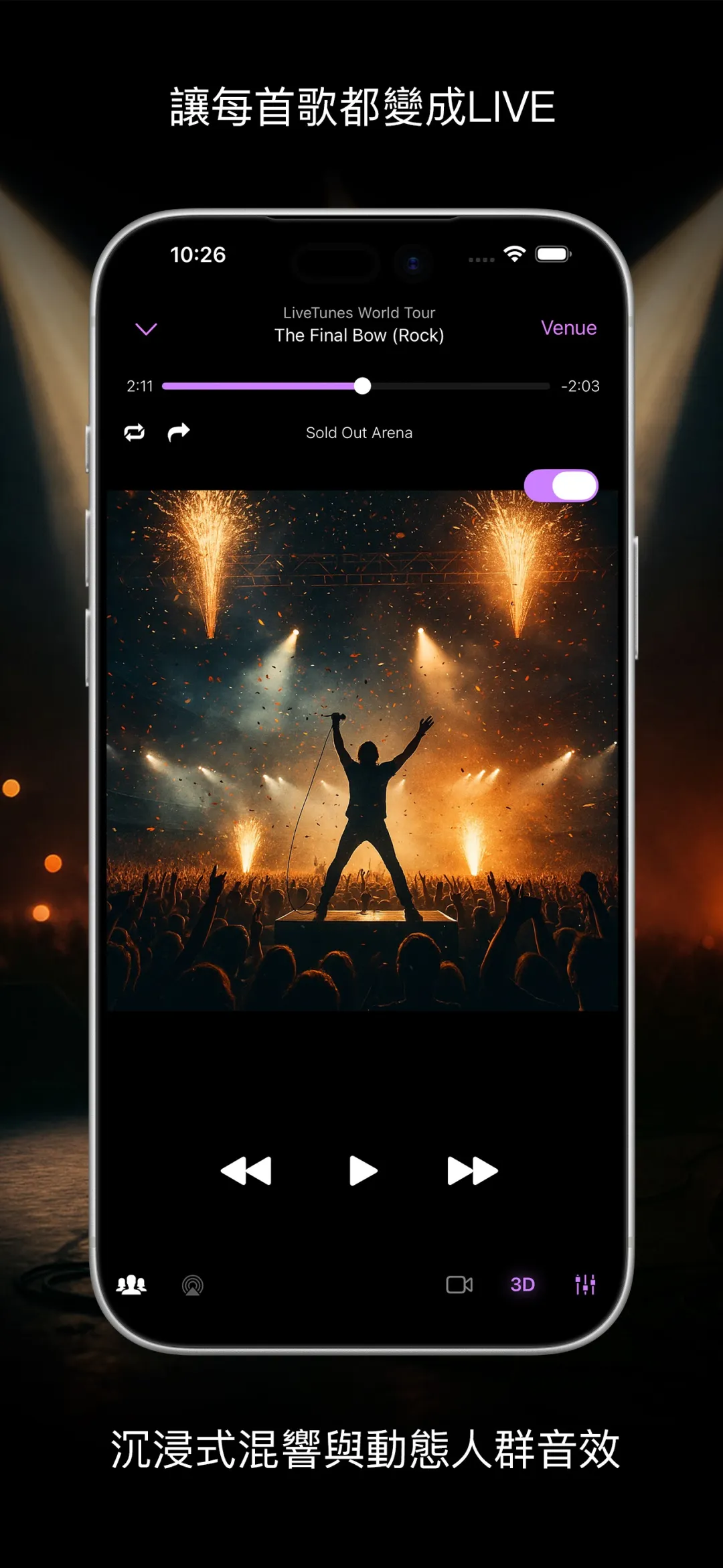 LiveTunes 是一款能将每首歌变成现场演唱会的音乐播放器。从小型酒吧到座无虚席的体育场——真实卷积混响、有反应的观众能量和空间音频,让每首歌都焕然一新。选一个场馆,建一个歌单,按下播放,就这么简单。