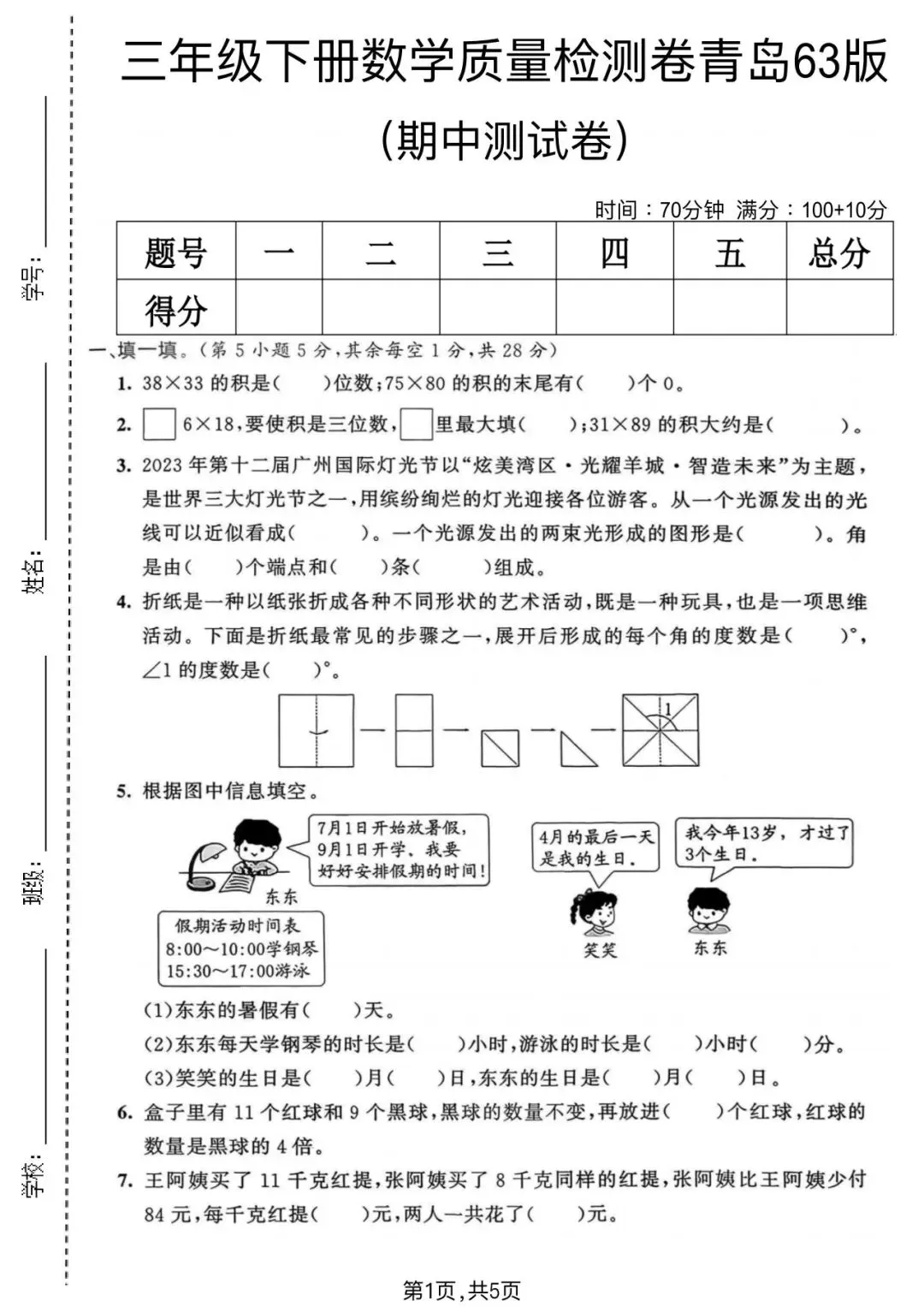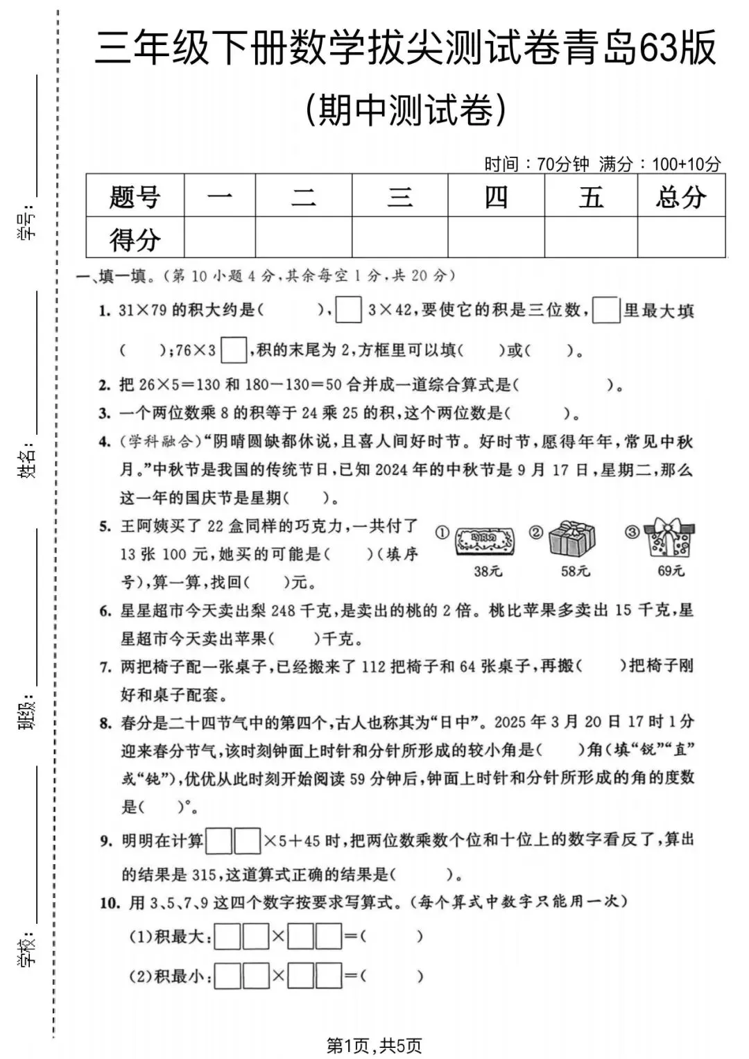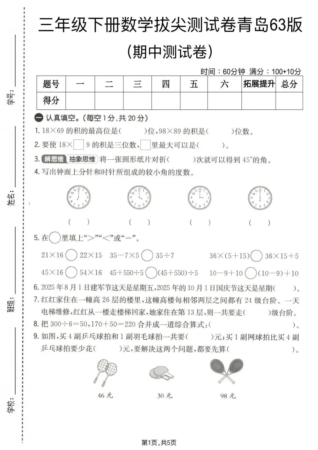 大家好!今天为大家分享的是;2025-2026学年青岛63版三年级下册数学期中真题质量检测卷及答案(5套)完整电子版可打印!