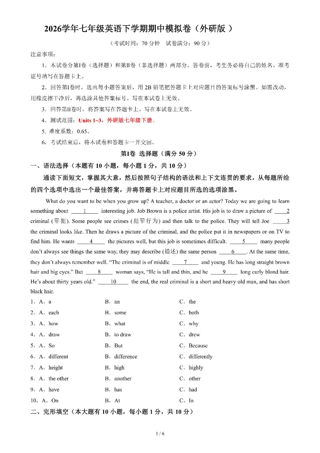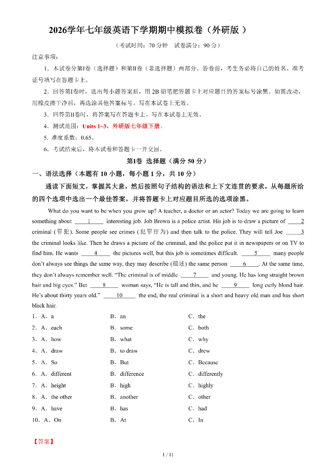 26春七年级下册《外研版》英语《期中模拟卷附答案》高清电子版可打印