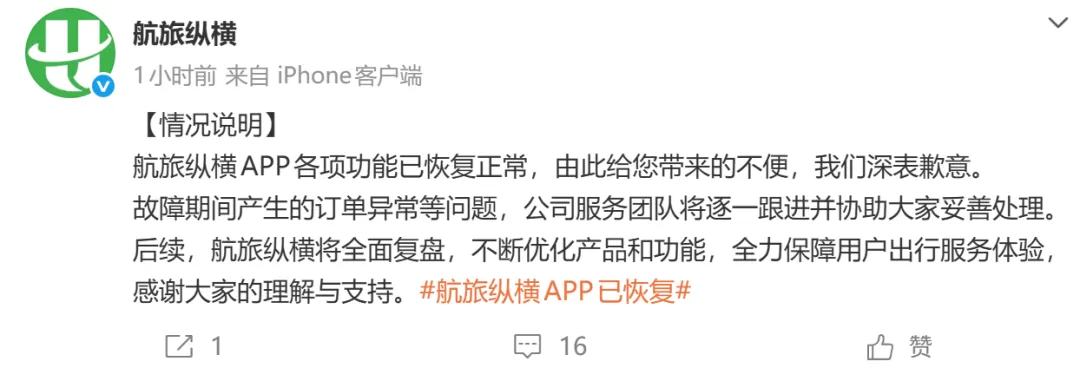 航旅纵横致歉:APP各项功能已恢复正常,故障期间产生的订单异常等问题,将逐一跟进并妥善处理