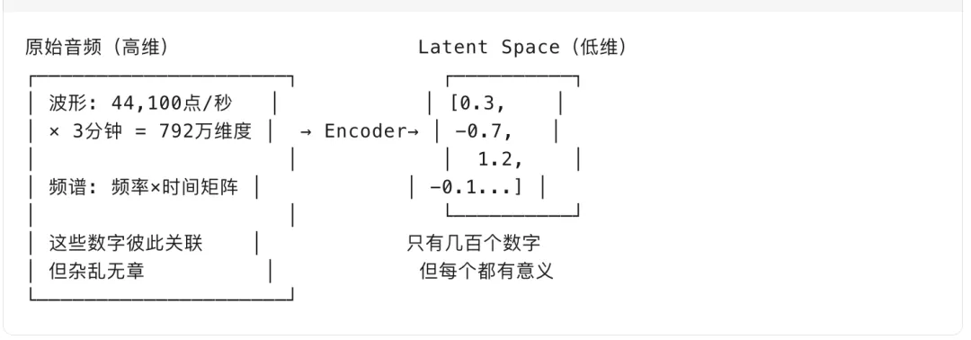 想象你有一首复杂的歌,包含旋律、音色、节奏、情感无数细节。Latent Space 就是把这些高维复杂信息压缩成低维向量的空间。