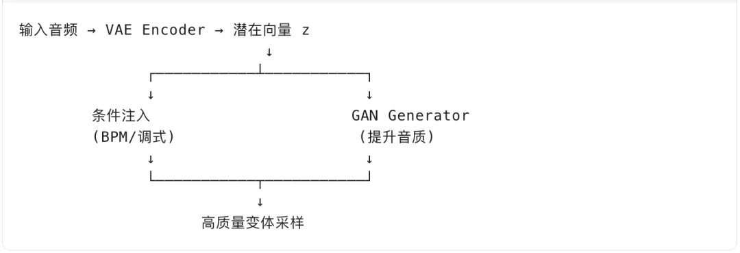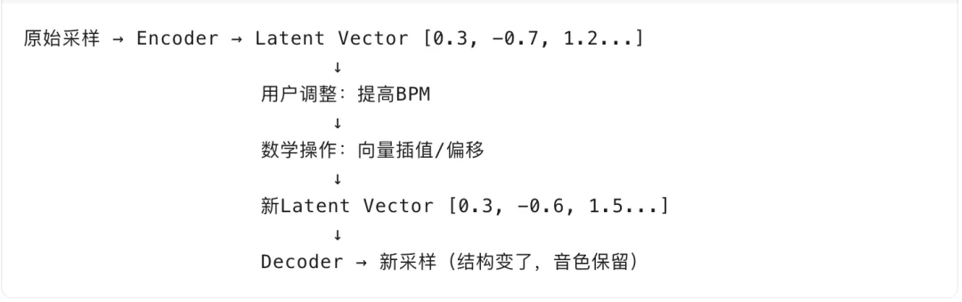 原始采样 → Encoder → 潜在空间(Latent Space)→ Decoder → 变体采样 ↓ 条件注入(调式、BPM、结构)