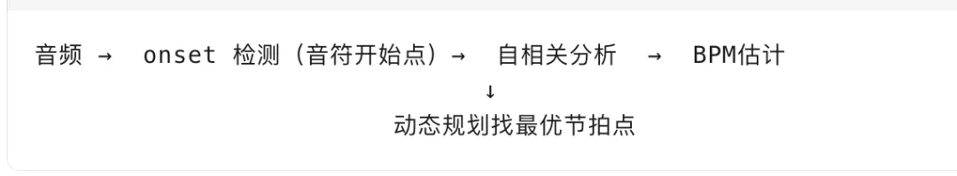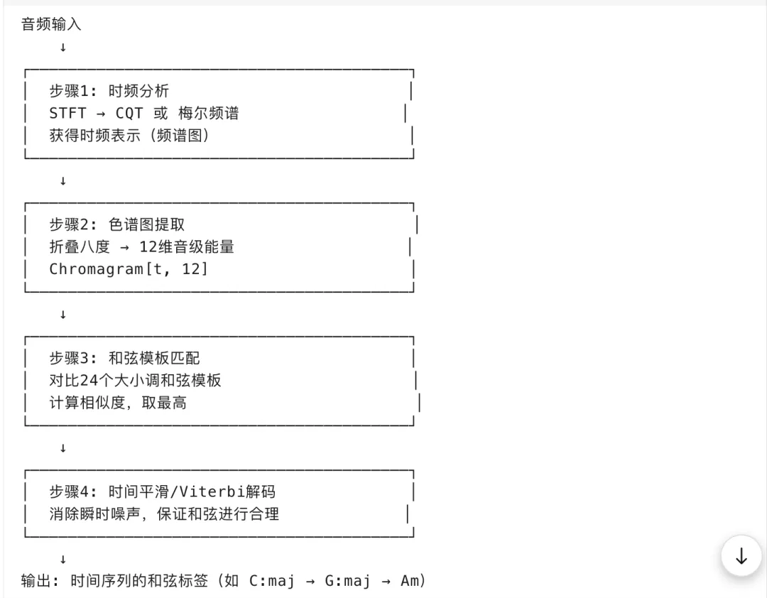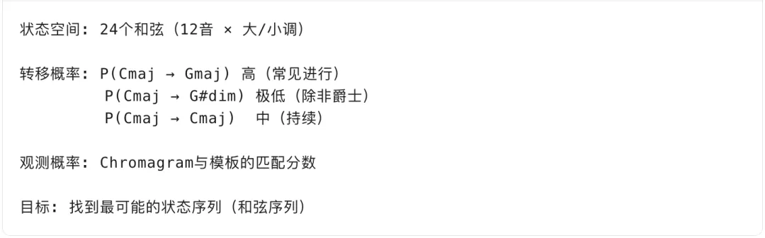 # 动态规划for t in 时间帧:for s in 所有和弦状态:# 当前帧最佳路径 = 前一帧所有路径 + 转移概率 + 观测概率dp[t][s] = max(dp[t-1][prev_s] +transition(prev_s, s) +observation(s, chromagram[t]))