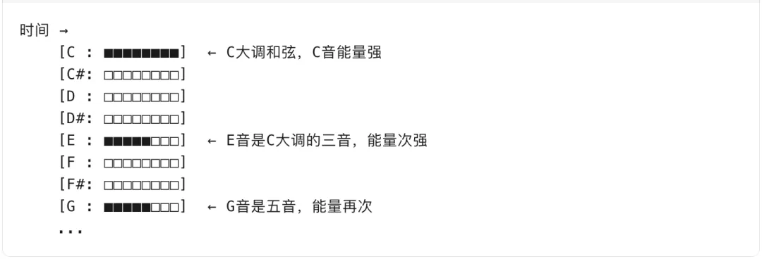 比如 C Major 和弦 = C(1) + E(0.6) + G(0.8) 的能量分布模式。